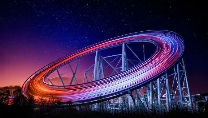 prompt: rollercoaster track with speed lights at night, glow in sky; fast motion