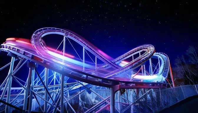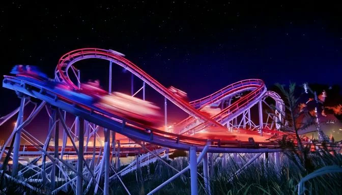 prompt: rollercoaster track with speed lights, carts with people, fast motion; at night, glow in sky