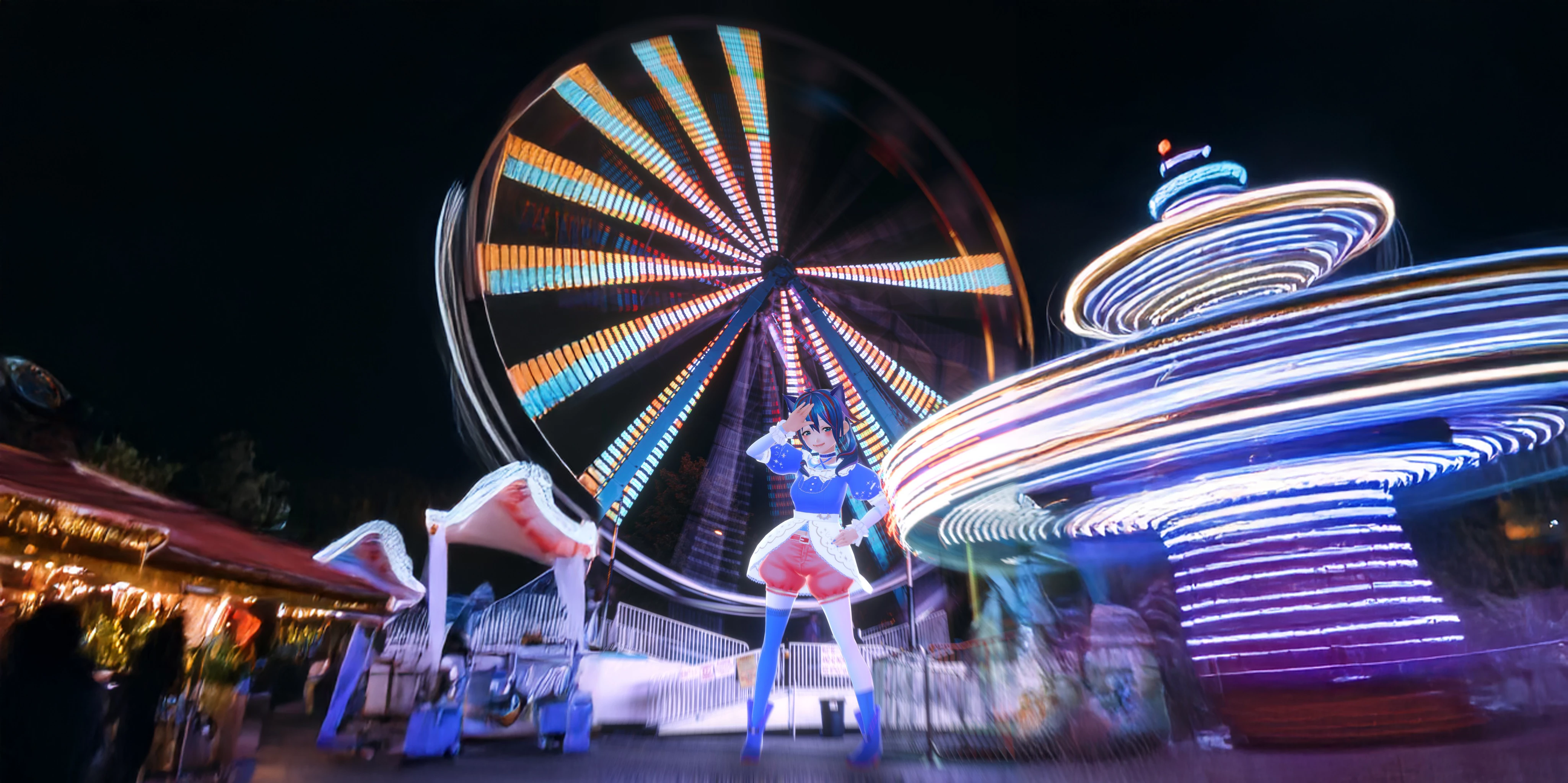 blue hair, anime dynamic pose standing in the middle of an amusement park Long exposure photography capturing a starry night sky and amusement park lights, showcasing the movement of stars as light trails, the movement of ferris wheel lights --v 6.0 --stylize 70 --style raw --ar 16:9