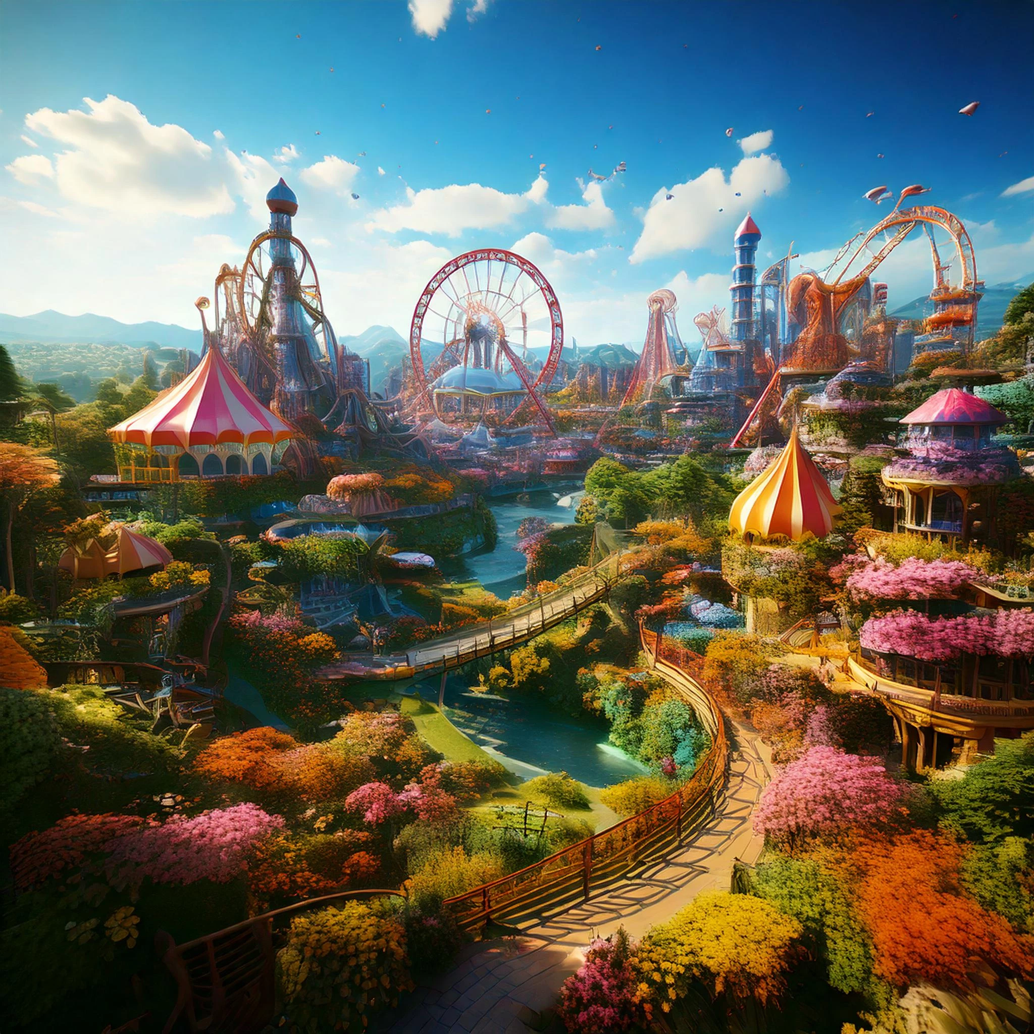 Highly detailed 3d rendering of a fantastic amusement park with a mythical creature theme. Soaring roller coasters climbing at impossible angles. Amazing spinning rides. A twisting Path that winds around the whole park like a flowered make. Sections of tranquil wilderness areas.