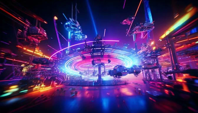 A space themed amusement park with small space crafts flying around exciting attractions and lots of neon lights