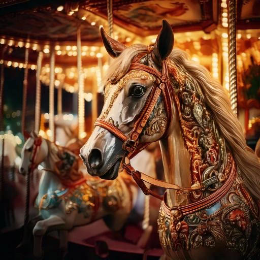 A close up of fantastic colourful vintage carousel at night. There is a blur of lights and motion. The wooden horses on the carousel show signs of ageing with paint peeling