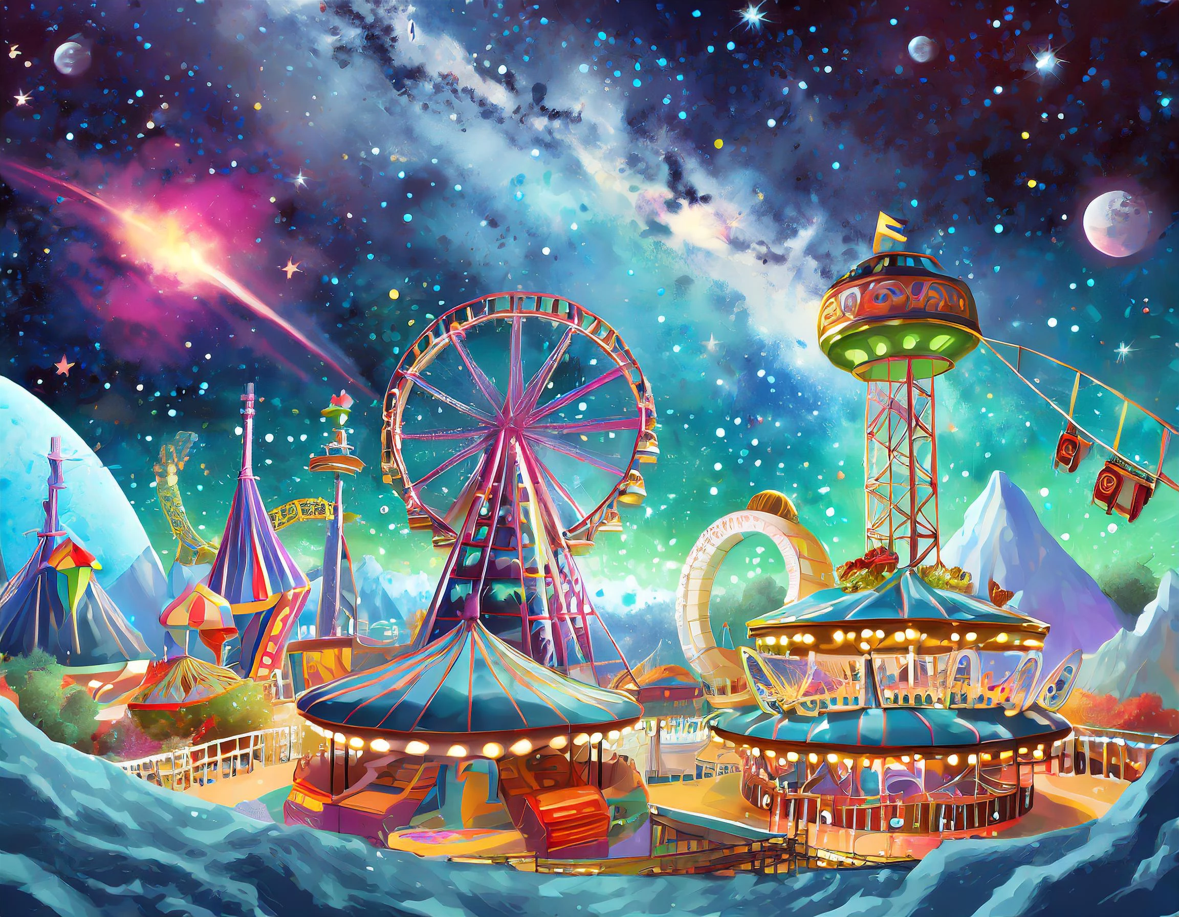 Prompt: An amusement park on the moon with roller coaster, ferris wheel and other rides, food and games, with a galaxy behind it; shooting star in night sky.