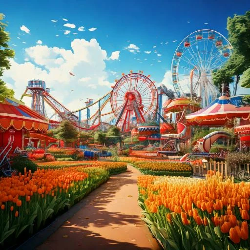 Prompt: Please create a scene of a colorful amusement and adventure park, with many rollercoasters, rides, playgrounds and facilities for food and drinks. The theme should be the Netherlands, so make use of the colors: red, white, blue and orange but don’t forget to add some greenery. To dive further into the theme please take inspiration from dutch culture; windmiles, bicycles, tulips and cheese.