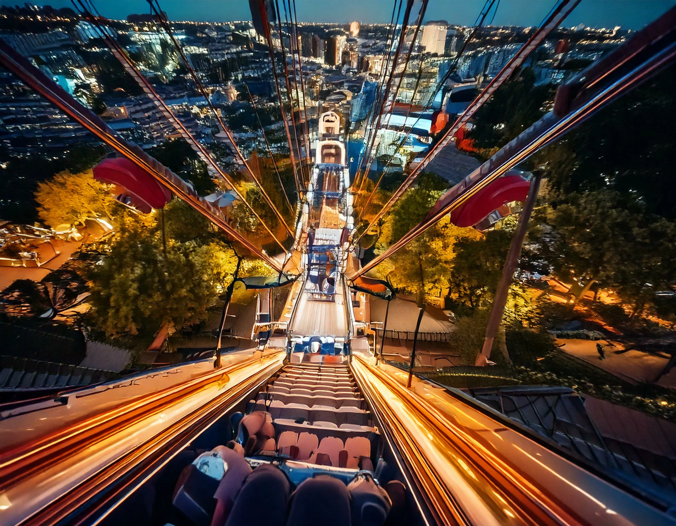 Une grande descente à la verticale, dans un parc d'attraction, vue subjective, avec beaucoup d'attractions autour, effet bokeh.