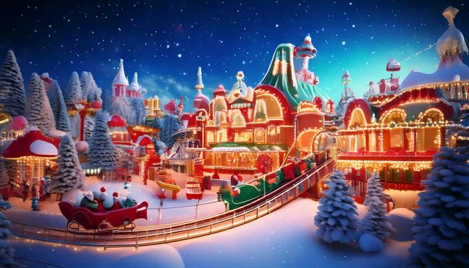 It's really been most challenging trying to come up with a decent result on this one; firefly doesn't seem like adventure parks. The prompt: Highly detailed Christmas amusement park with a roller coaster lite up with Christmas lights....Art, Vibrant Colors, 3D