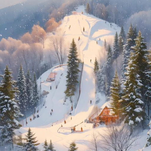 Mountain park covered in fluffy cloud like snow with ski jumps , skiiers riding down the hill and onlookers sit by a fireplace sipping warm hot chocolate