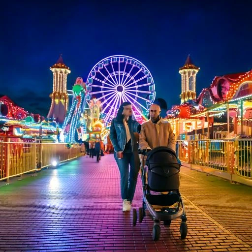 a mother and father pushing a stroller along a brightly lit path in an amusement park with many exciting rides