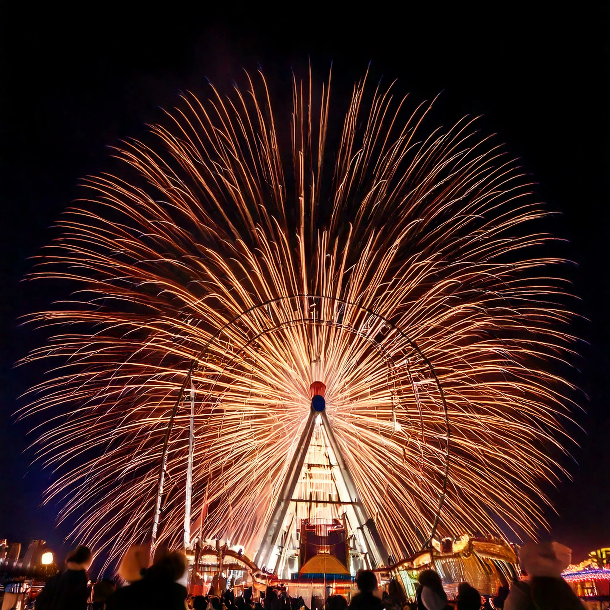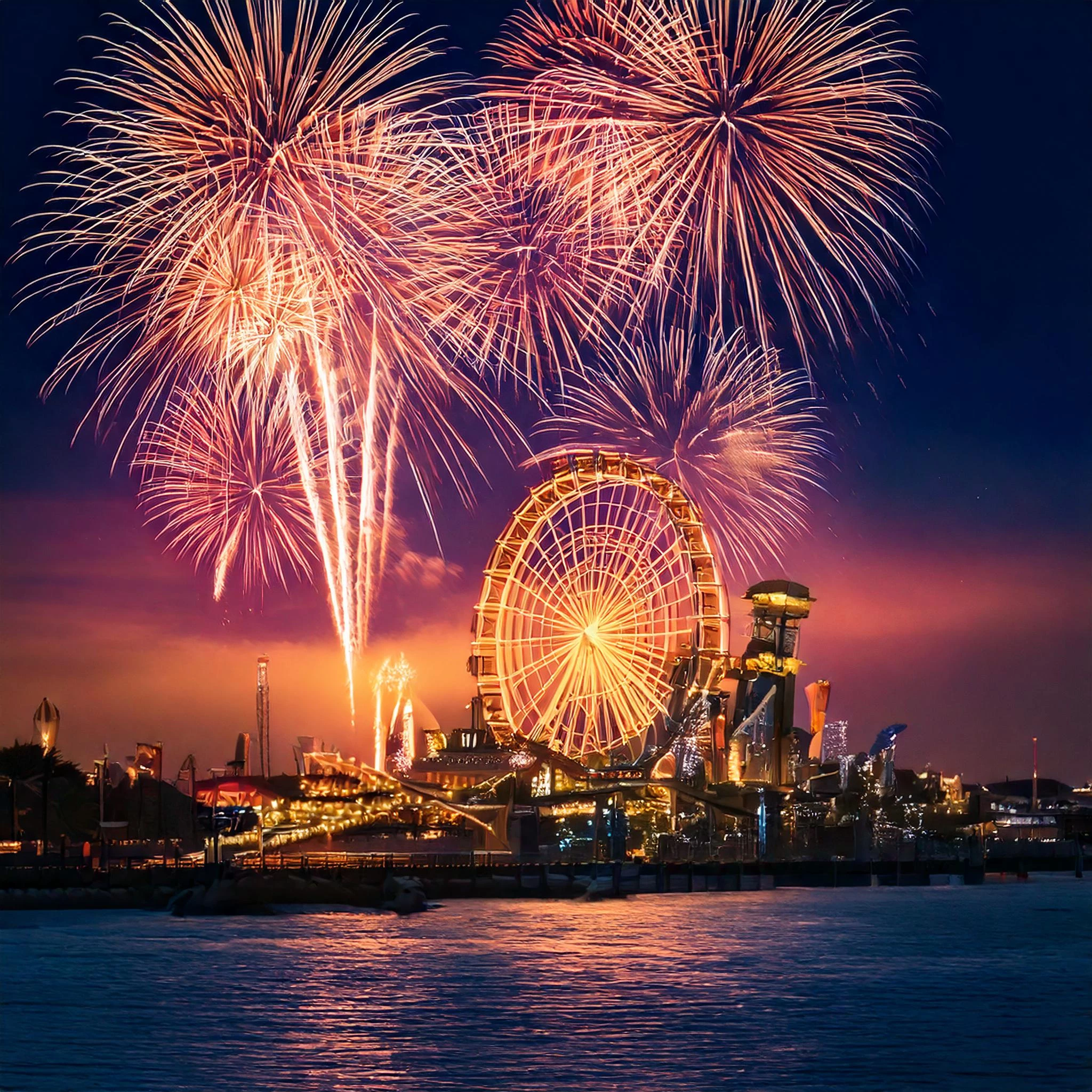 Prompt: Dive into a paradise of thrills! Conquer towering rides, discover magical realms, and end the day with fireworks lighting up the night sky.