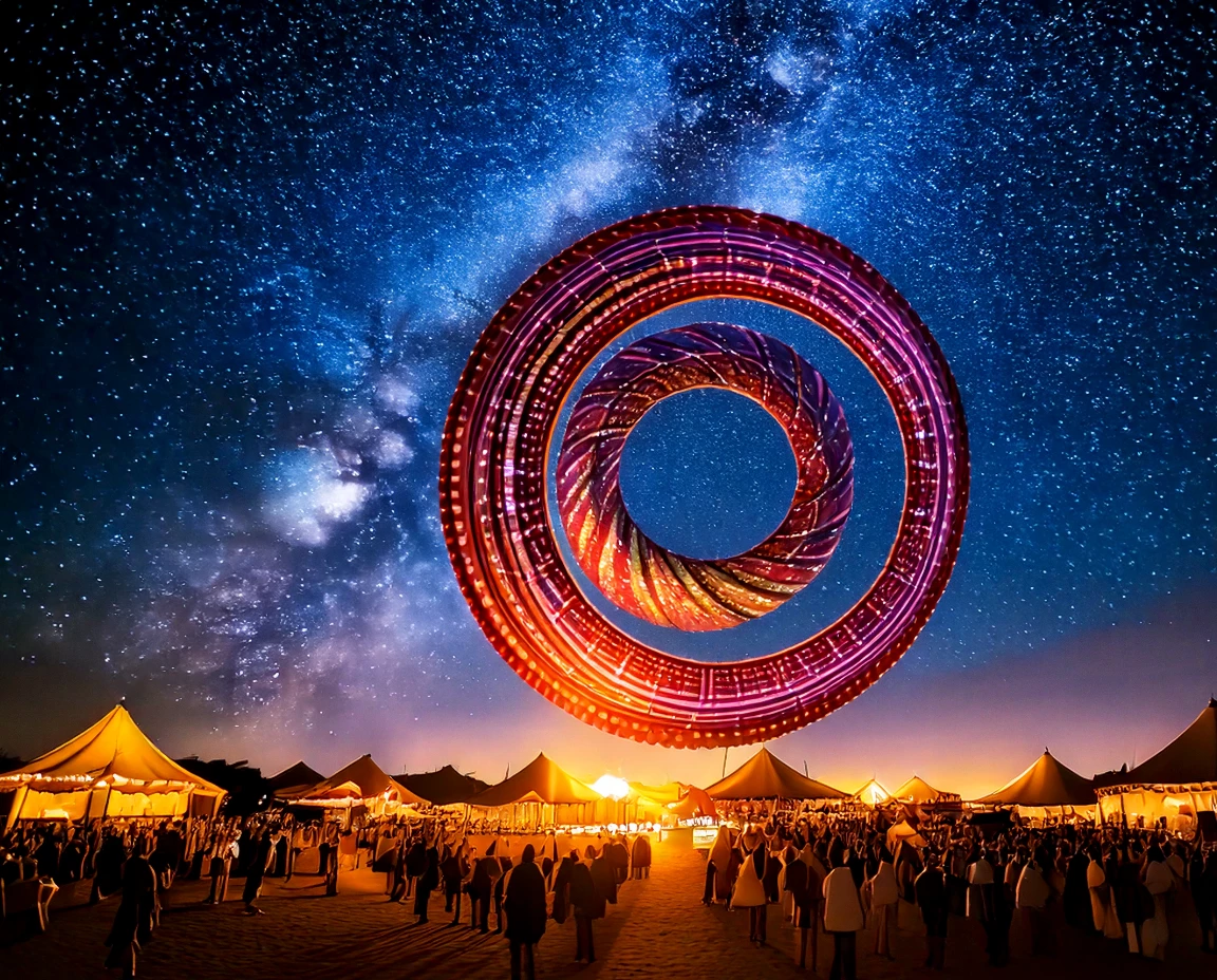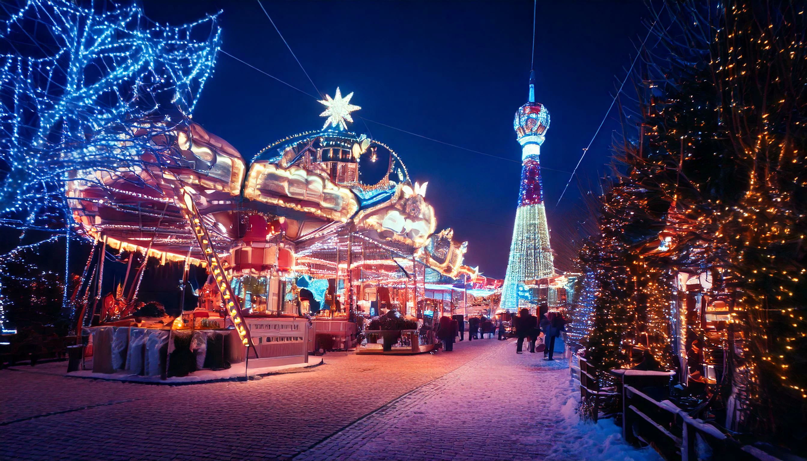The Prompt I used: An evening view of a bustling street in an adventure park, featuring illuminated rides and colorful gaming booths. The background is blurred, highlighting the vibrant attractions and lively atmosphere