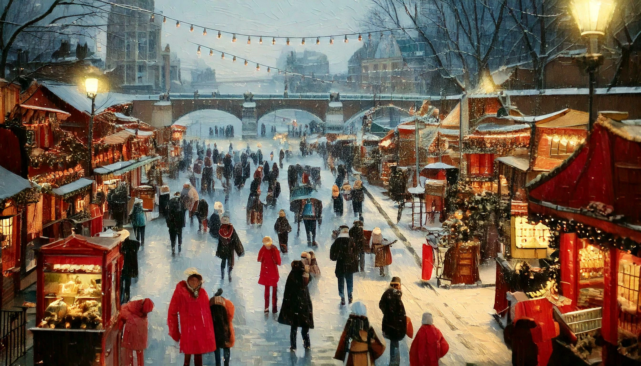 It proved remarkably difficult to convince Firefly to produce something remotely like a fair on a frozen river. Without a reference image, it was impossibe. Human figures are less grotesque if the prompt does not also call for horses, at which point bizarre horses, bizarre people, and even more bizarre horse/human chimeras show up. The various flaws are ameliorated by rendering the scene as an oil painting. They stand out as errors in a photo-real image.