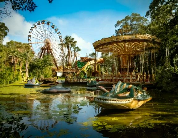 Prompt: generate a fantastical amusement park in a swamp with alligators; include a carousel, a Ferris wheel, and a roller coaster
