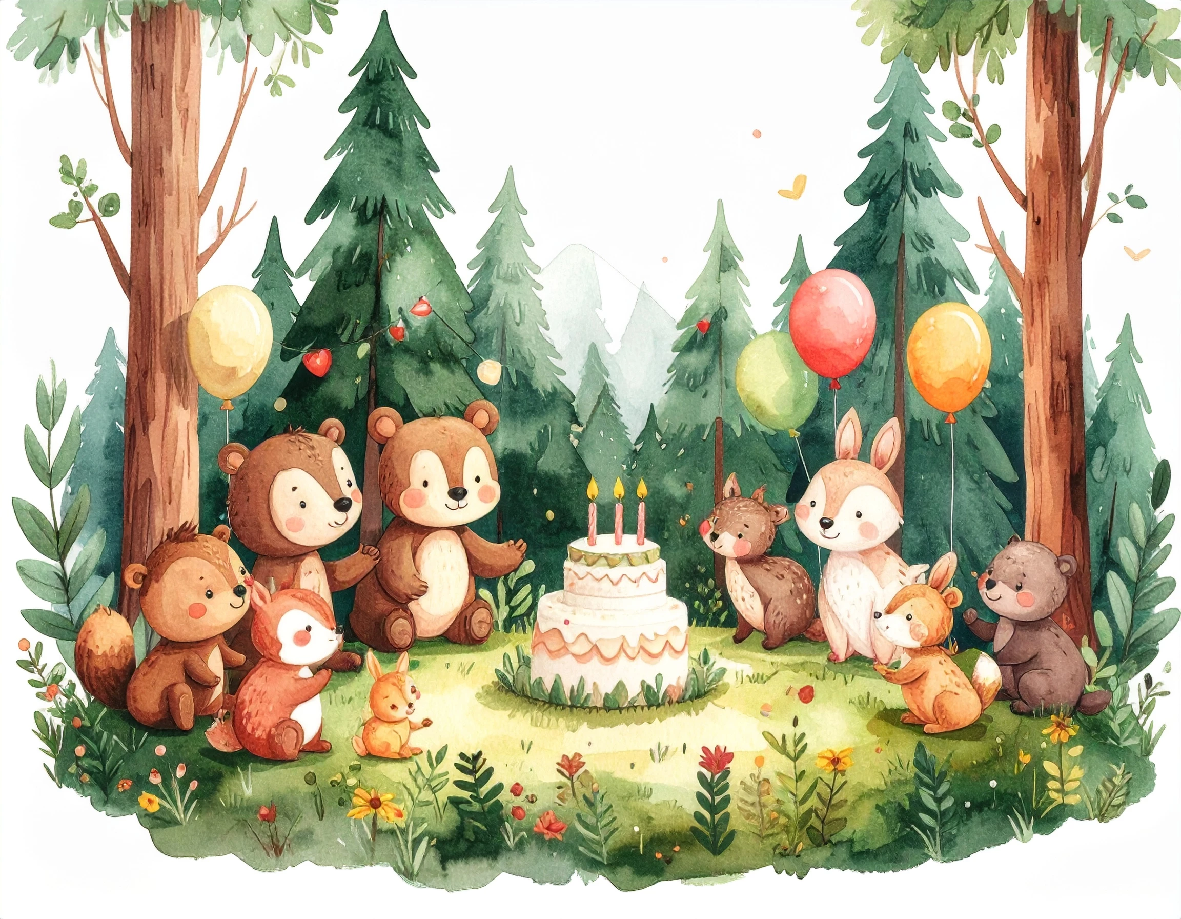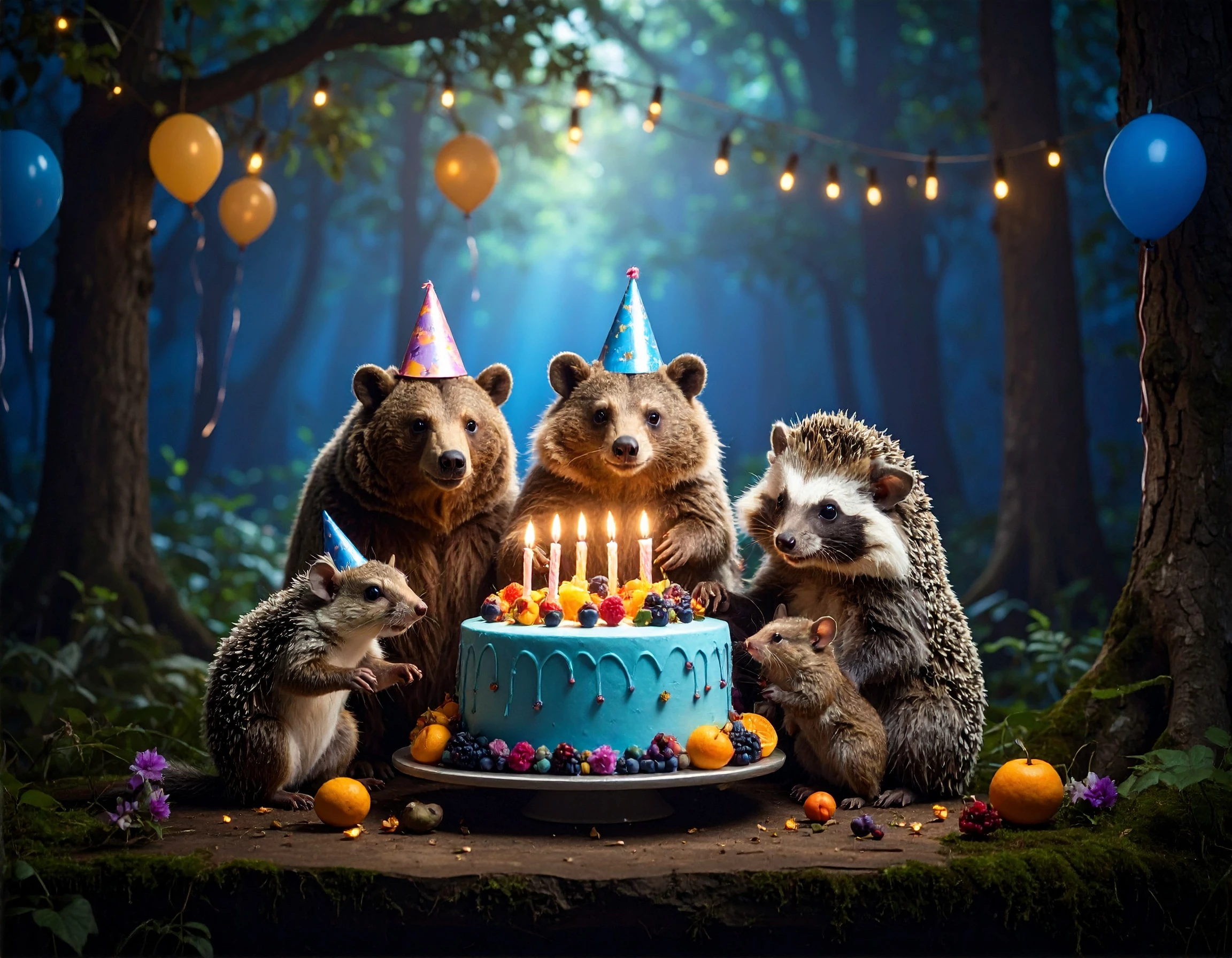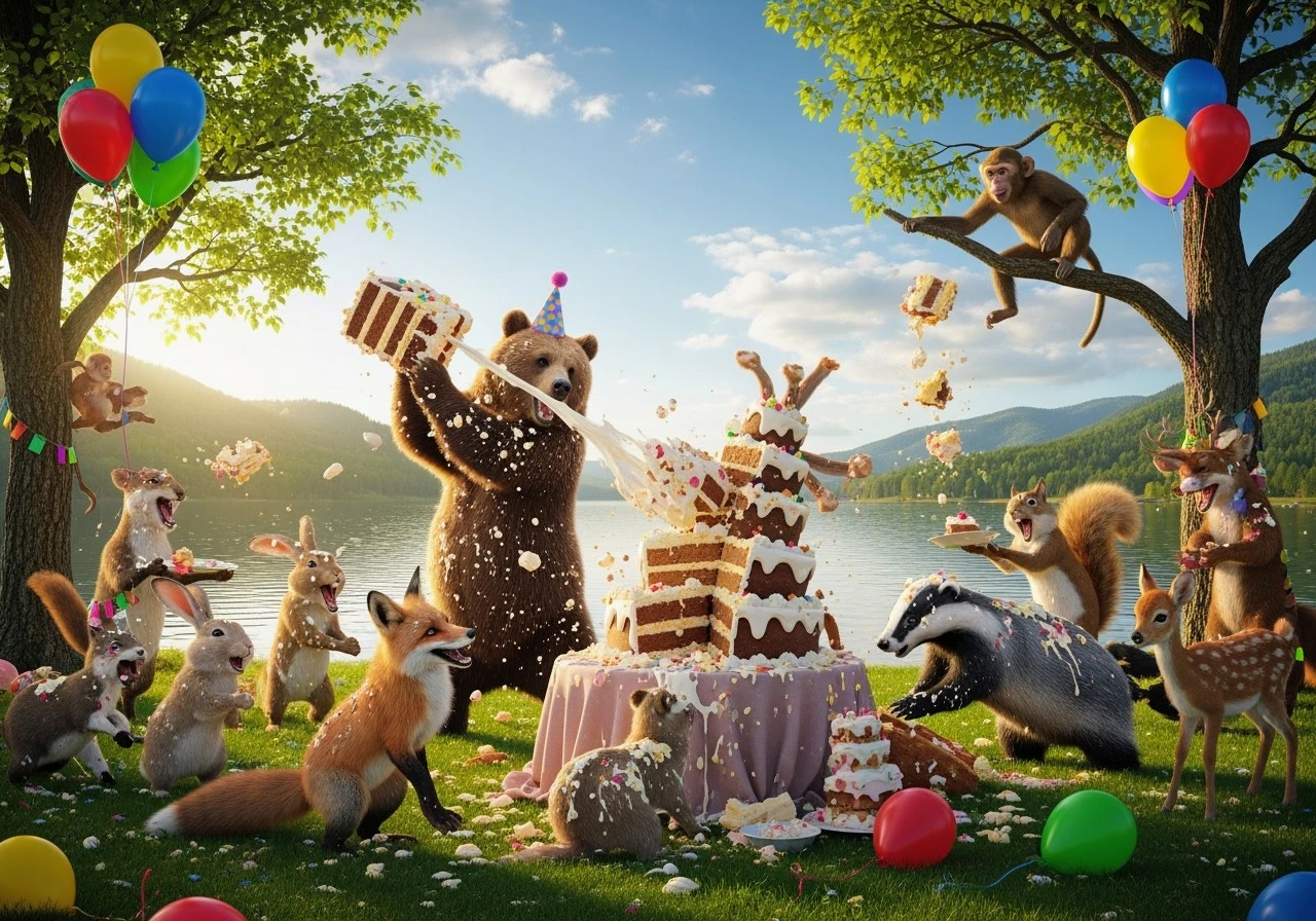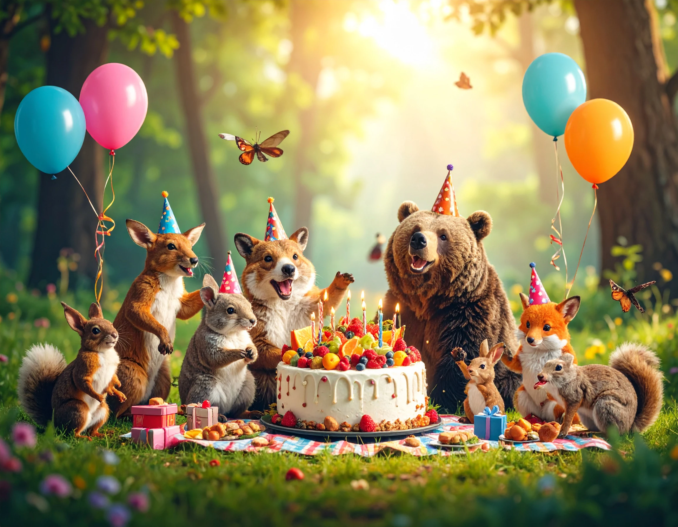 The prompt I used: A highly detailed joyful, colorful animal birthday party set in a sunny forest. bear, fox, rabbit, and squirrel are wearing party hats and gathered around a large cake decorated with fruits and flowers. Balloons hang from tree branches, storybook-style illustration.