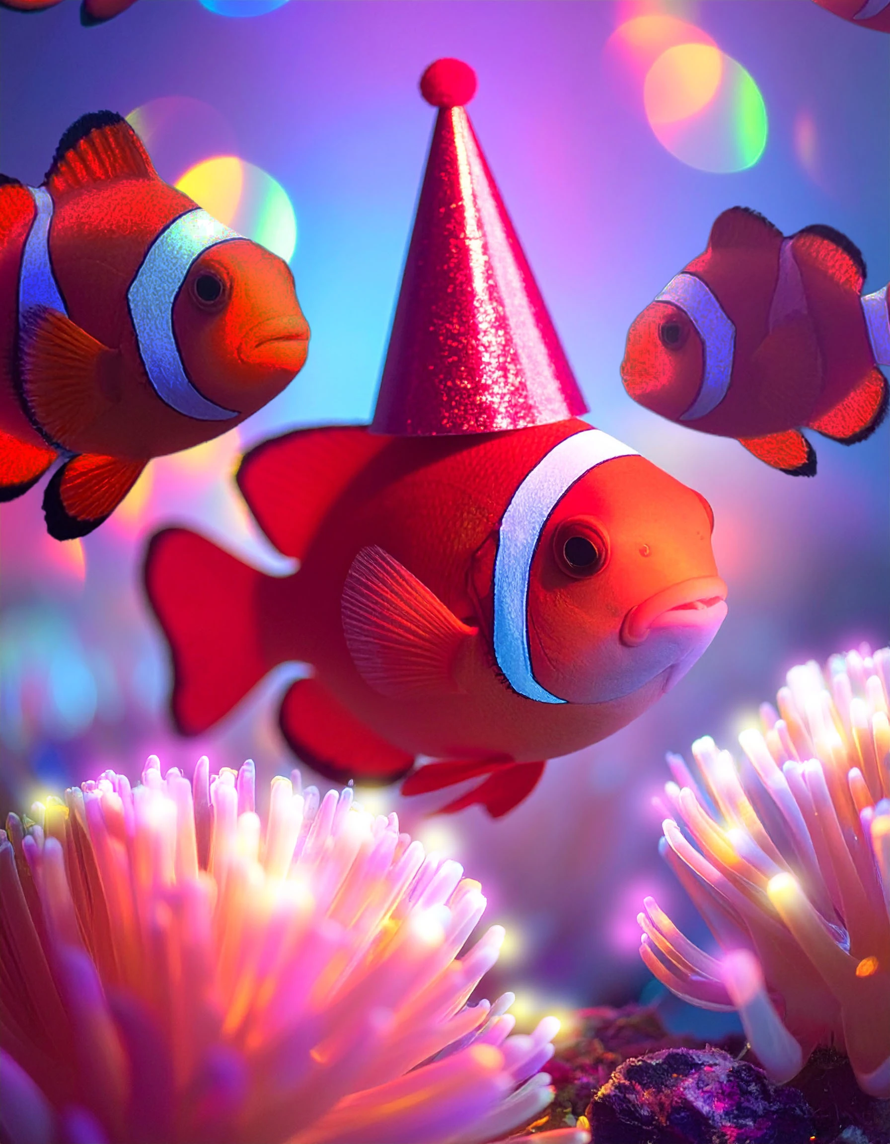 Prompt: A highly detailed joyful, clownfishes birthday party set in tropical waters of the Indo-Pacific. Clownfishes and corals are colorful. Clownfishes wear a party hat. Corals are full of white and delicate lights. Style anime