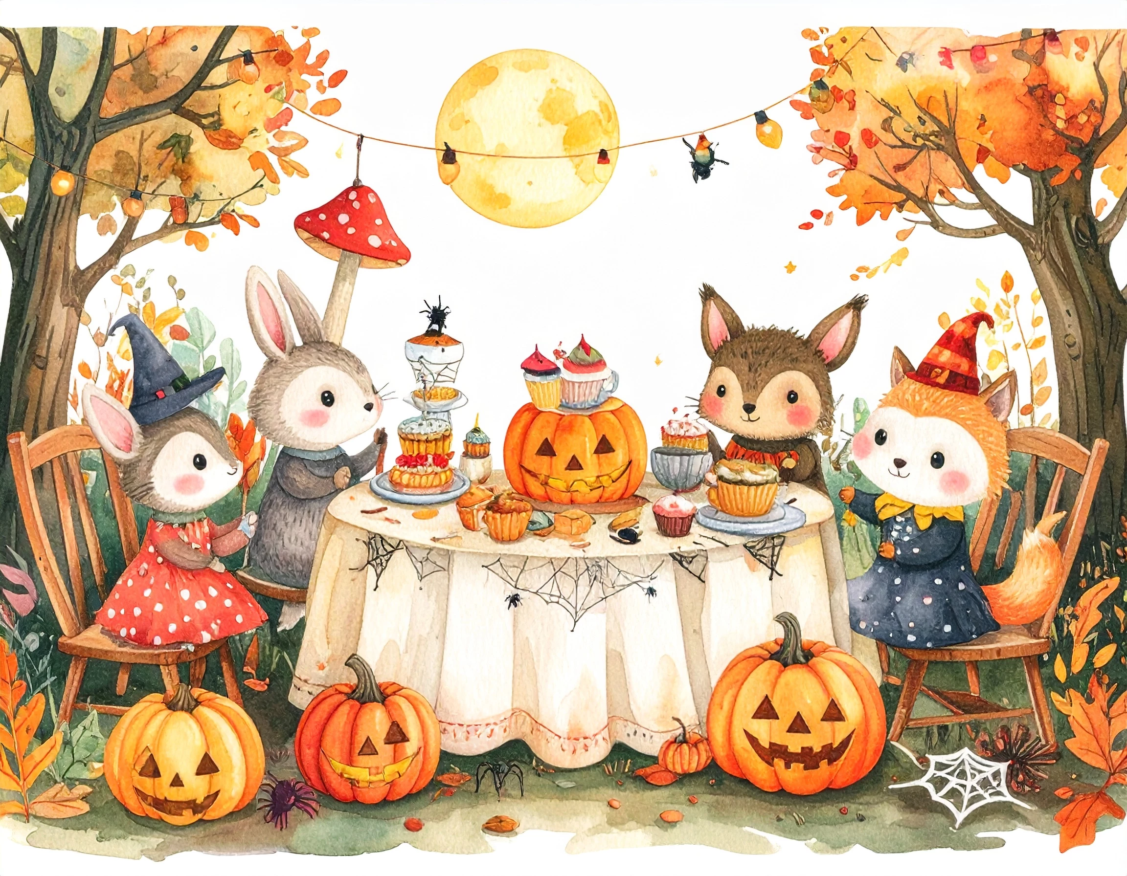 Water colour painting, Halloween tea party with many different animals participating in a forest