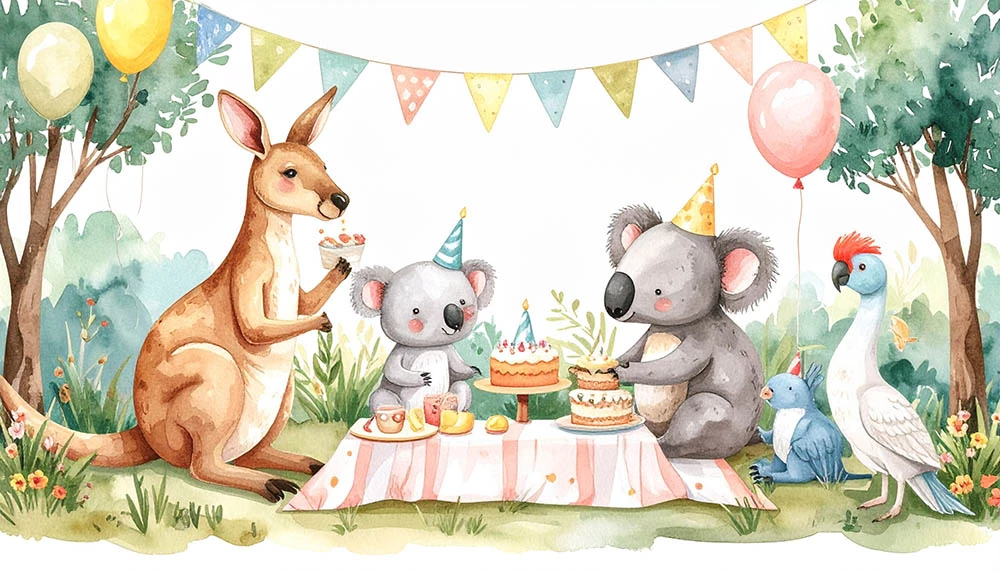 A cheerful Australian outdoor picnic scene with kangaroo, koala, wombat, and kookaburras - celebrating a birthday. They are gathered around a picnic blanket with a birthday cake, balloons, and party hats, in a sunny bushland setting with eucalyptus trees. Colourful and bright.