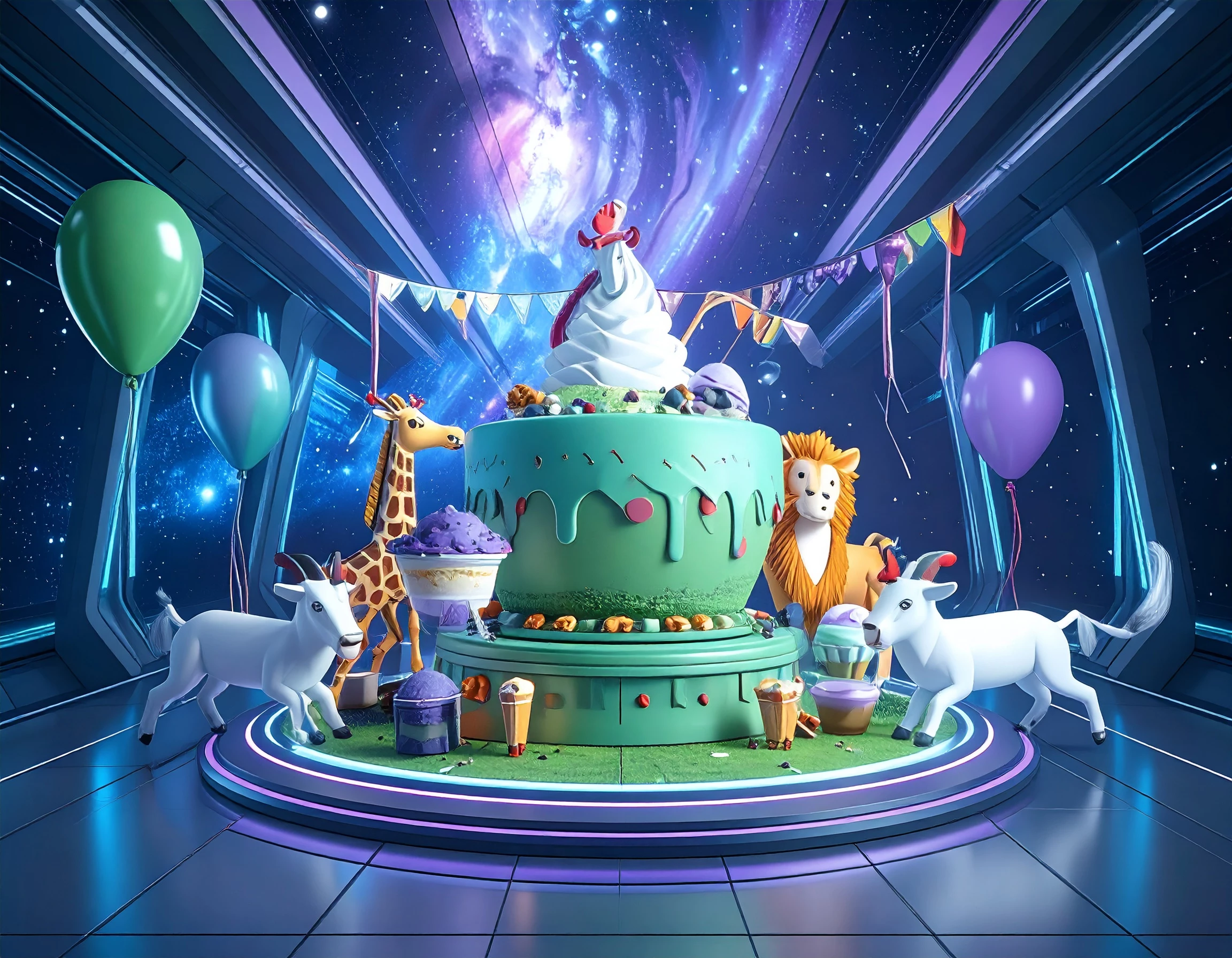 Prompt: roosters, giraffes, lions, goats in the galaxy, matcha cake party , ube ice cream, balloons, streamers
