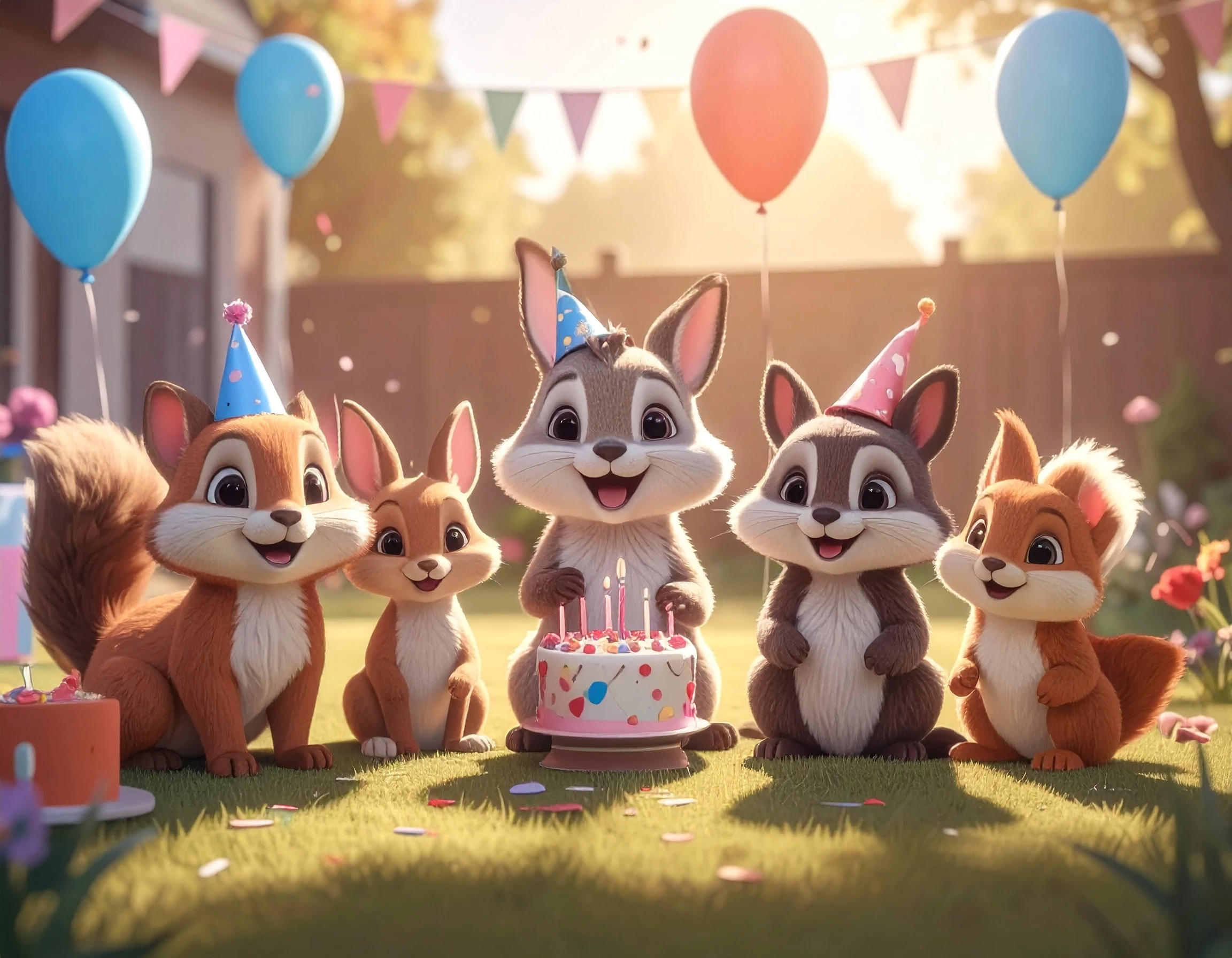 Prompt: A joyful birthday party in a sunny backyard, a cast of adorable animals — a group of adorable animals in party attire. The scene is bursting with pastel balloons, streamers, and confetti in the air, warm golden afternoon light, ultra-cute cartoon style with big expressive eyes, soft painterly textures, and rich detail, cinematic depth of field, high-resolution illustration.