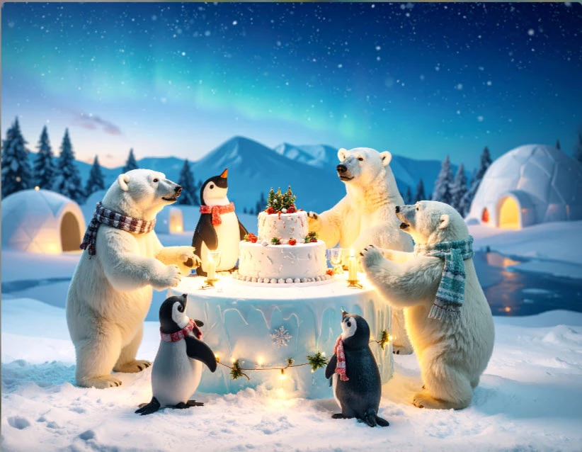 highly detailed photo realistic Winter Wonderland Celebration: Polar bears, penguins, and seals around an ice cake, surrounded by snowflakes and igloos, wearing cozy scarves and mittens.