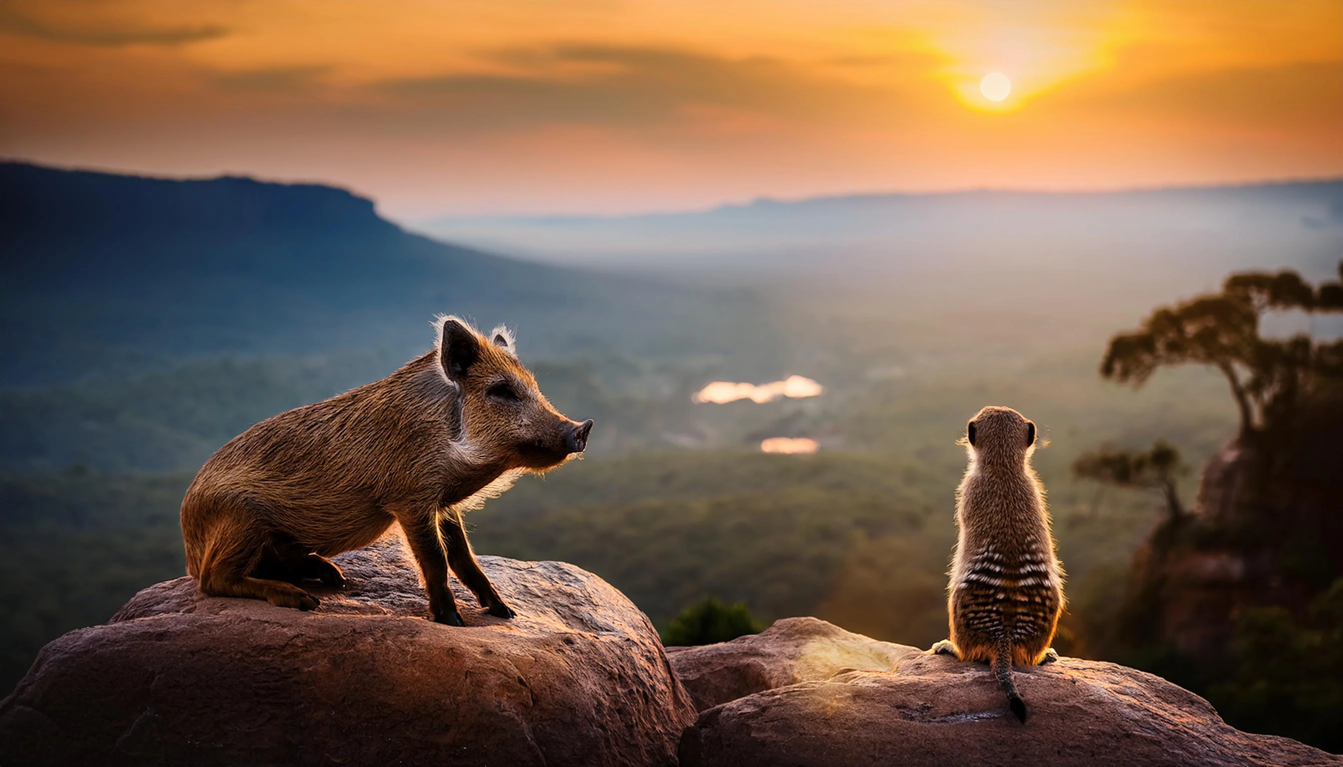 A wild boar pig and meerkat sitting on a big rock on a cliff looking to huge valley with rivers, trees, birds, with moutains far way, sunset, warm light, wide view