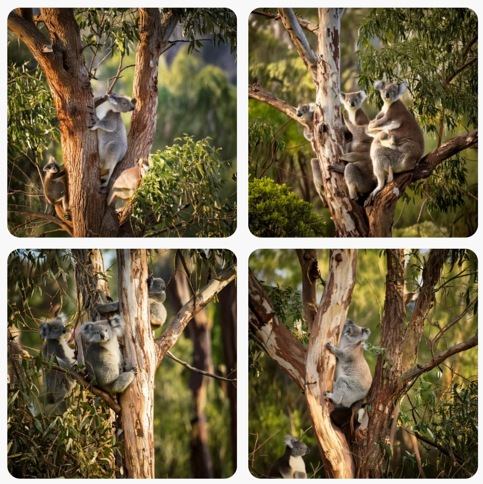 Prompt: In the bush a hungry koala sits in the fork of a tall gumtree eating. In a small clearing a family of 3 kangaroos can be seen. A kookaburra sits on a nearby branch laughing.