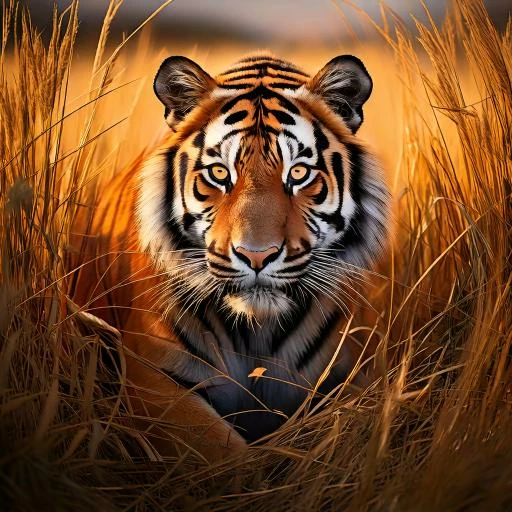 a camouflaged tiger sitting among tall grass stalking his prey