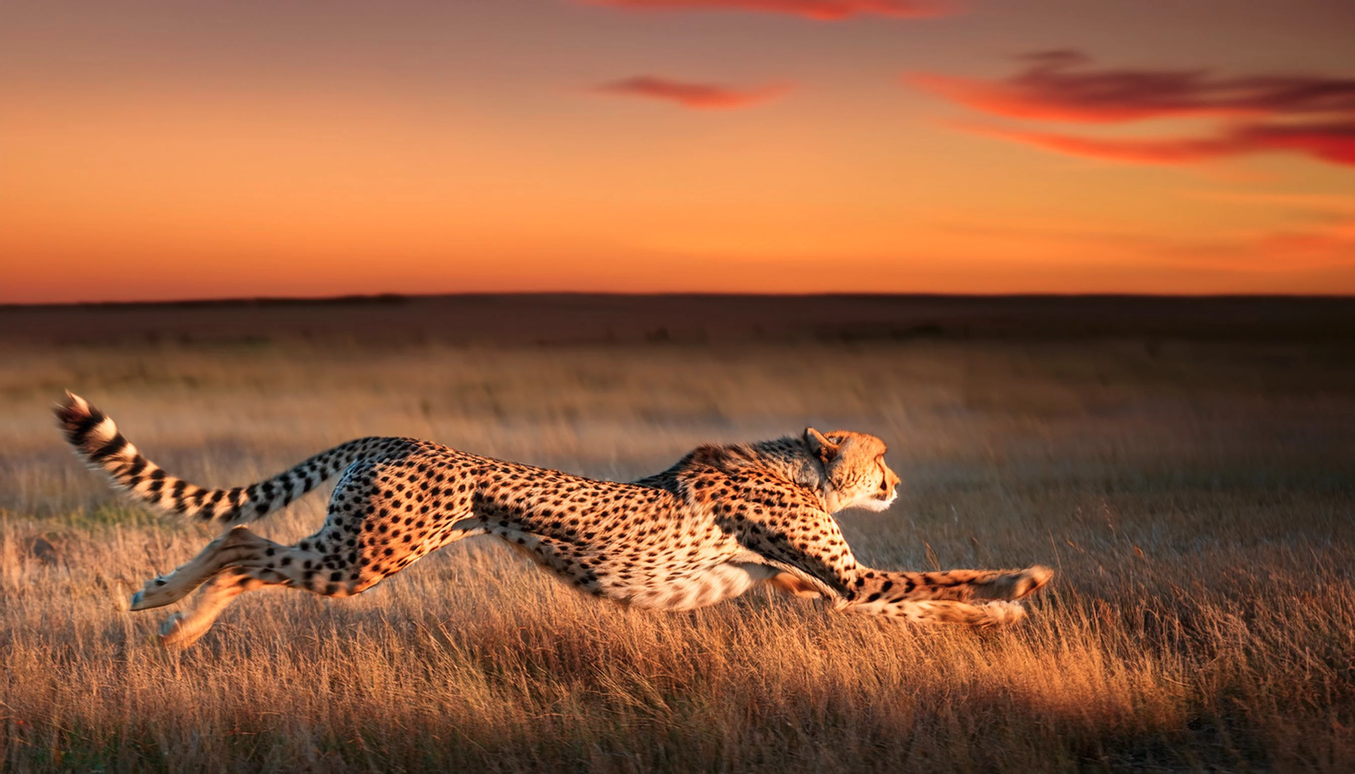 Prompt: Wide angle side view of a running cheetah at full motion high speed on the plains. Front and back feet are fully extended. It's late in the afternoon, near dusk. The sun sets on the horizon. We see the background blurred out due to the motion blur and the cheetah tack sharp.