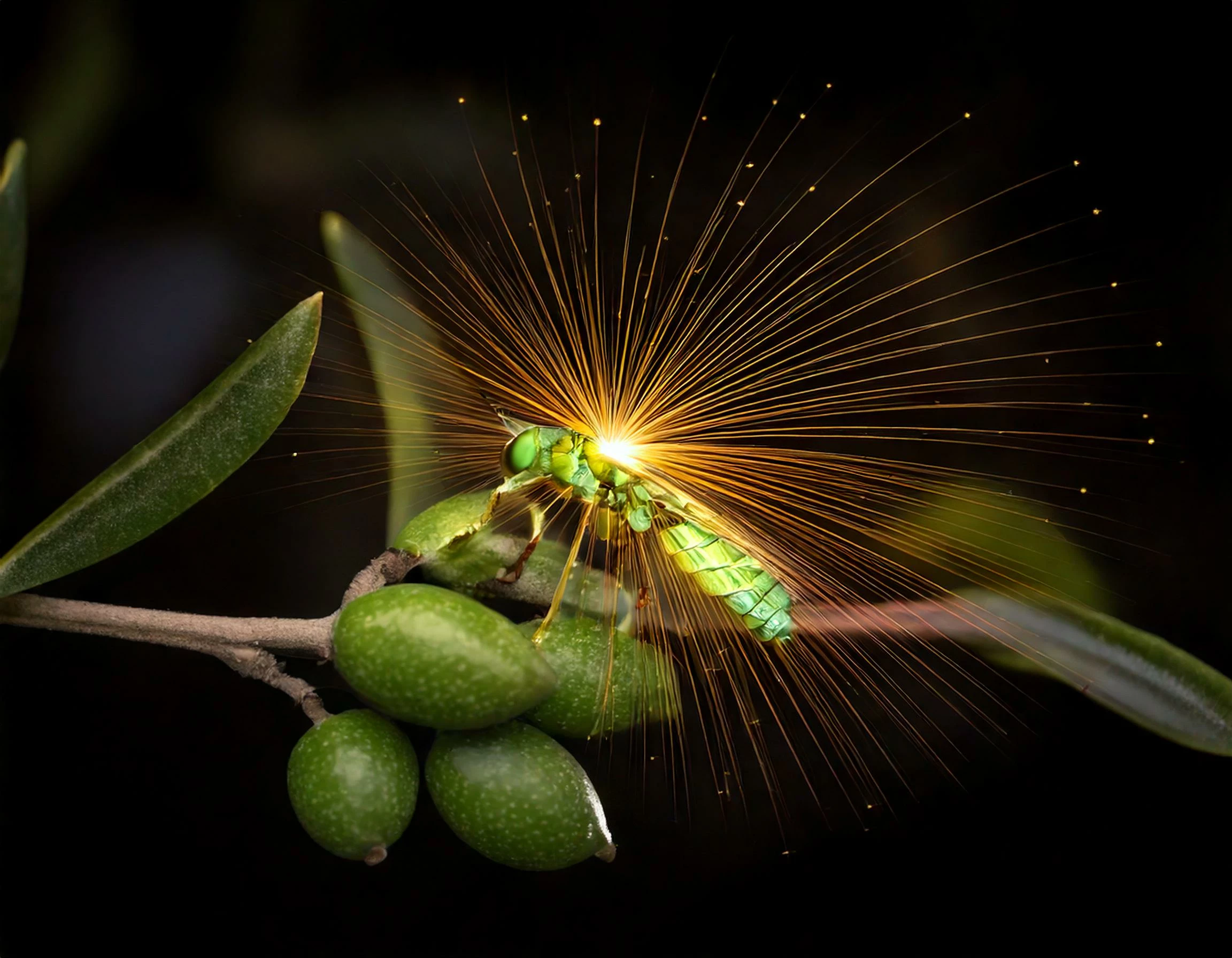 (A firefly walking on an olive branch)
