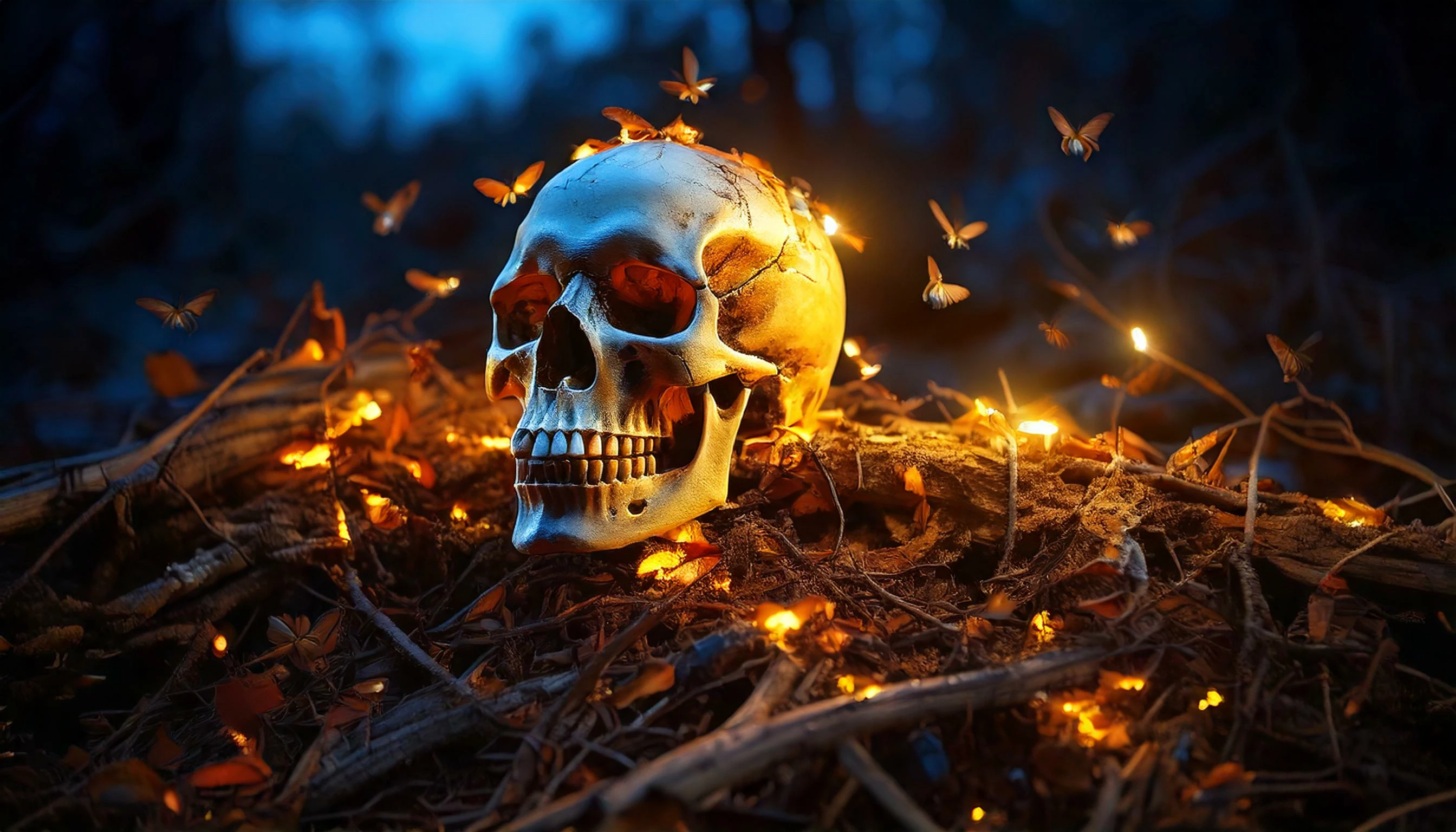 sinister colorfull fireflies sitting on a pile of bones and a skull close-up, macro, dramatic light