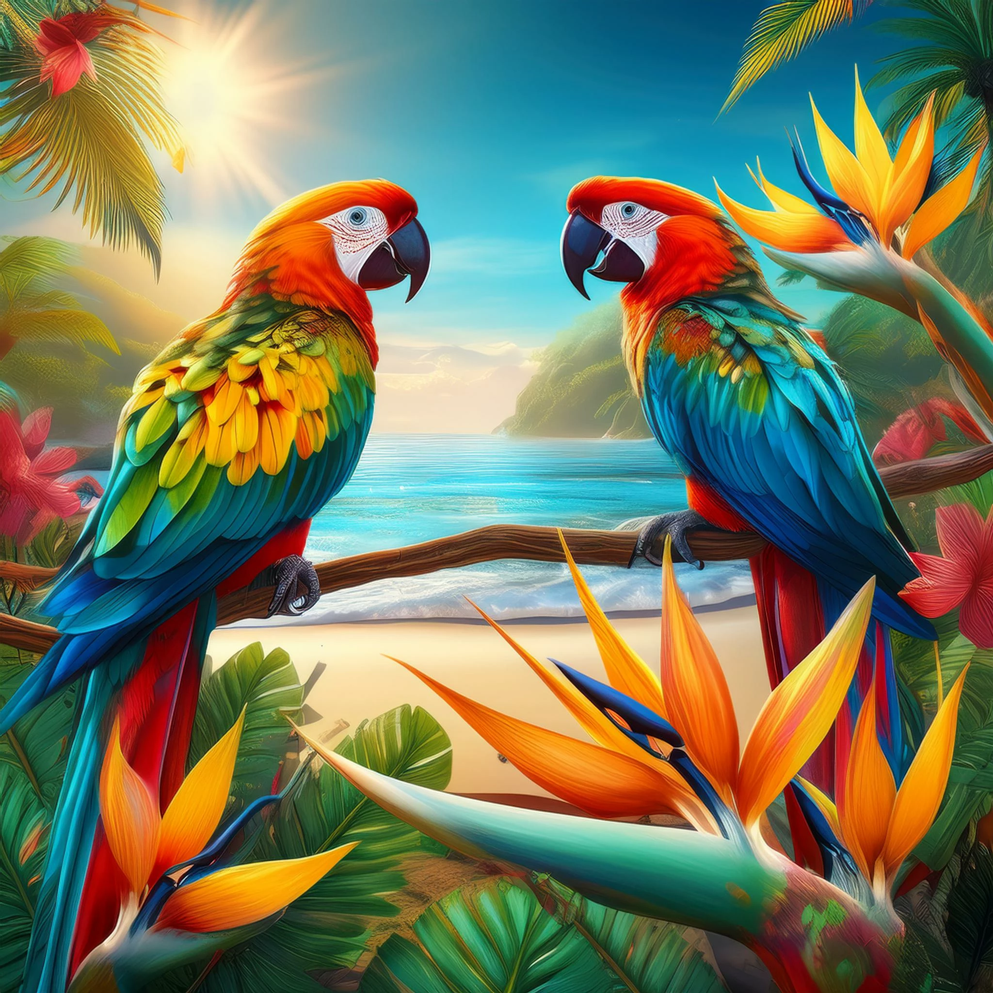 Here is mine.  Prompt: A realistic image of a tropical forest with two different colorful parrots looking at each other with the birds of paradise flowers background and with having a sunny beach in the background