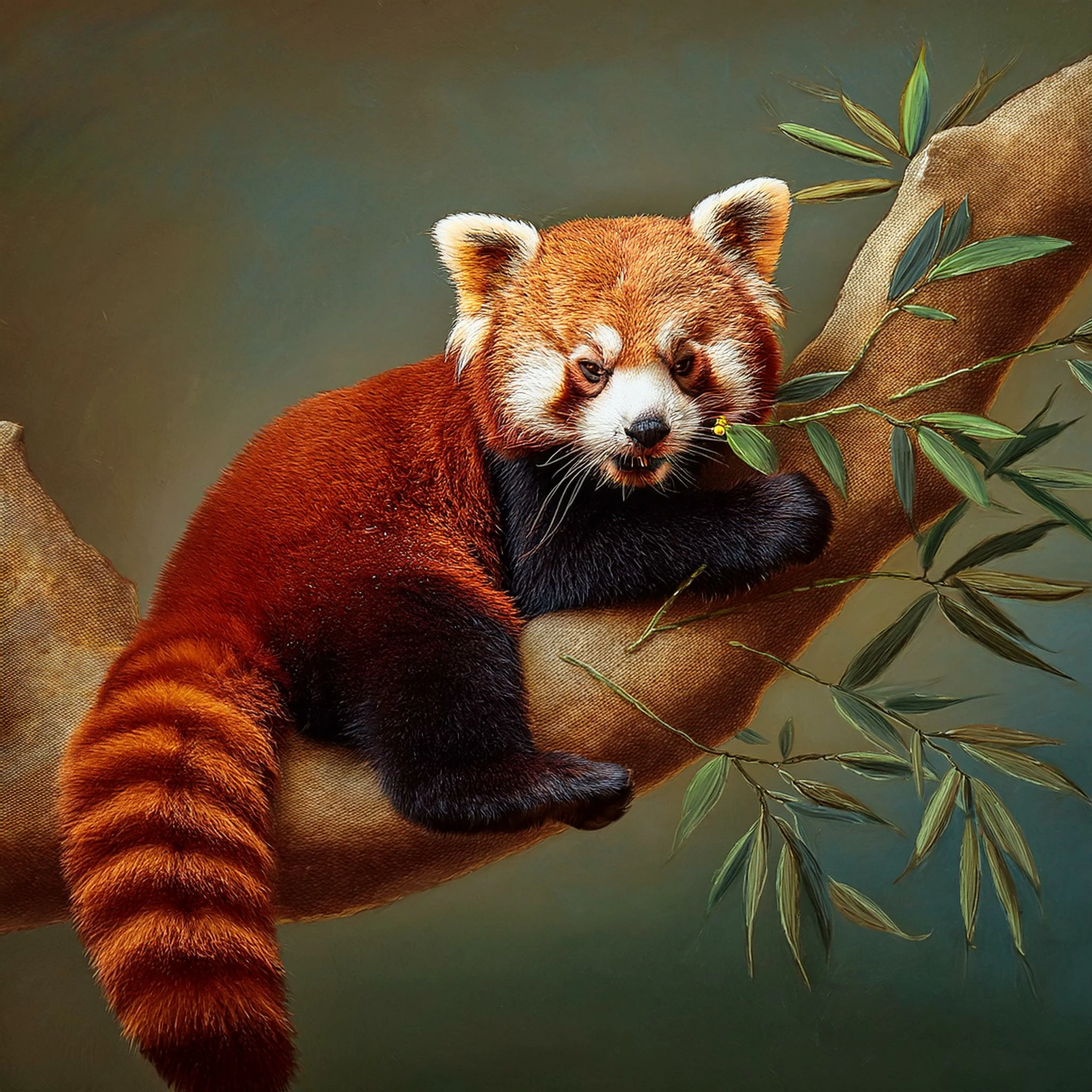 red panda lying on a branch and seen from behind, while eating green bamboo leaves
