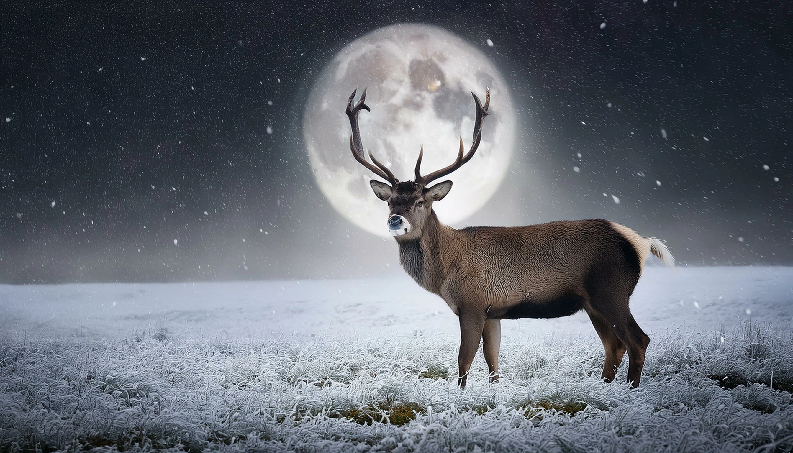 Raindeer in snowy field snow flakes falling moon lighting up the night monotonous