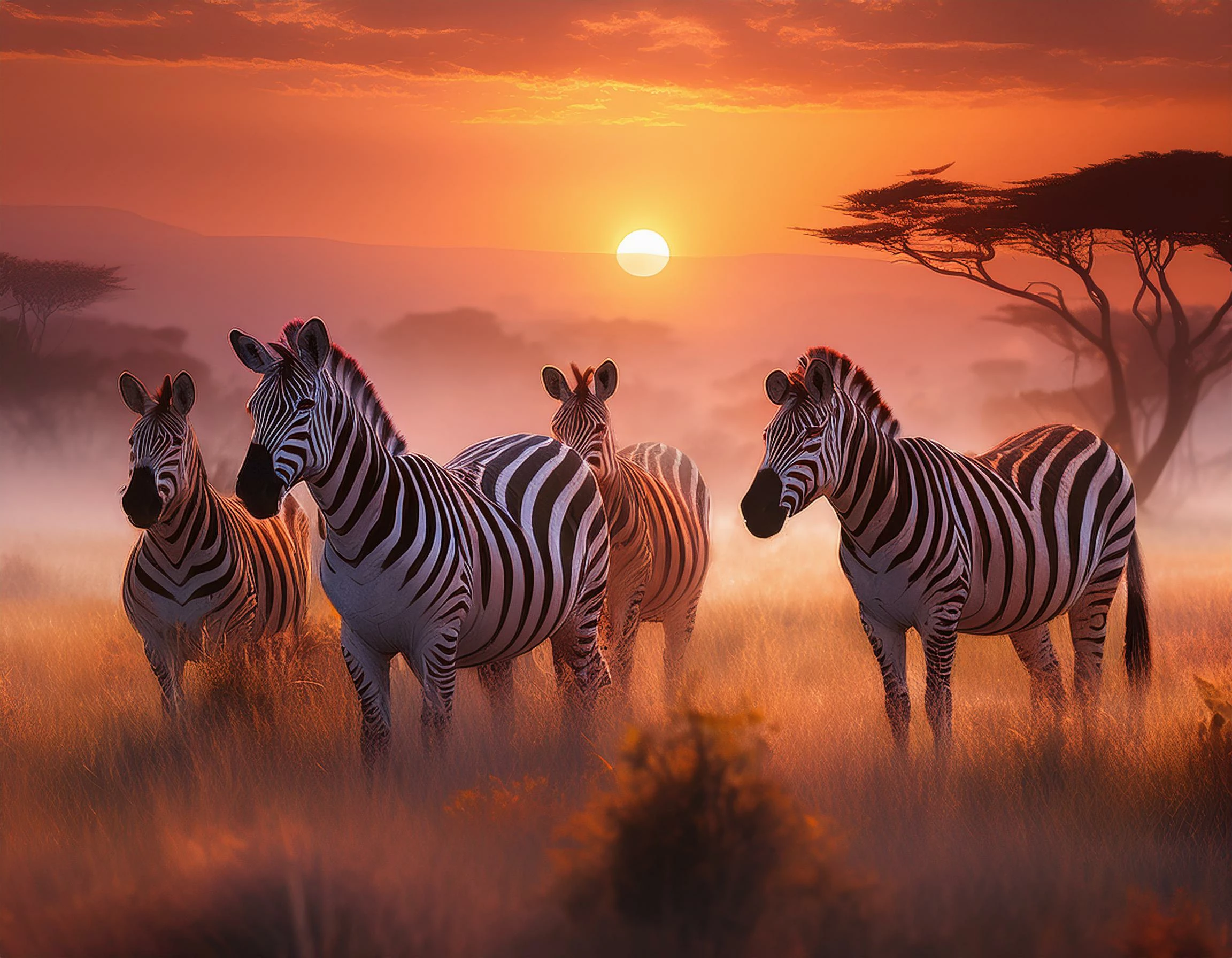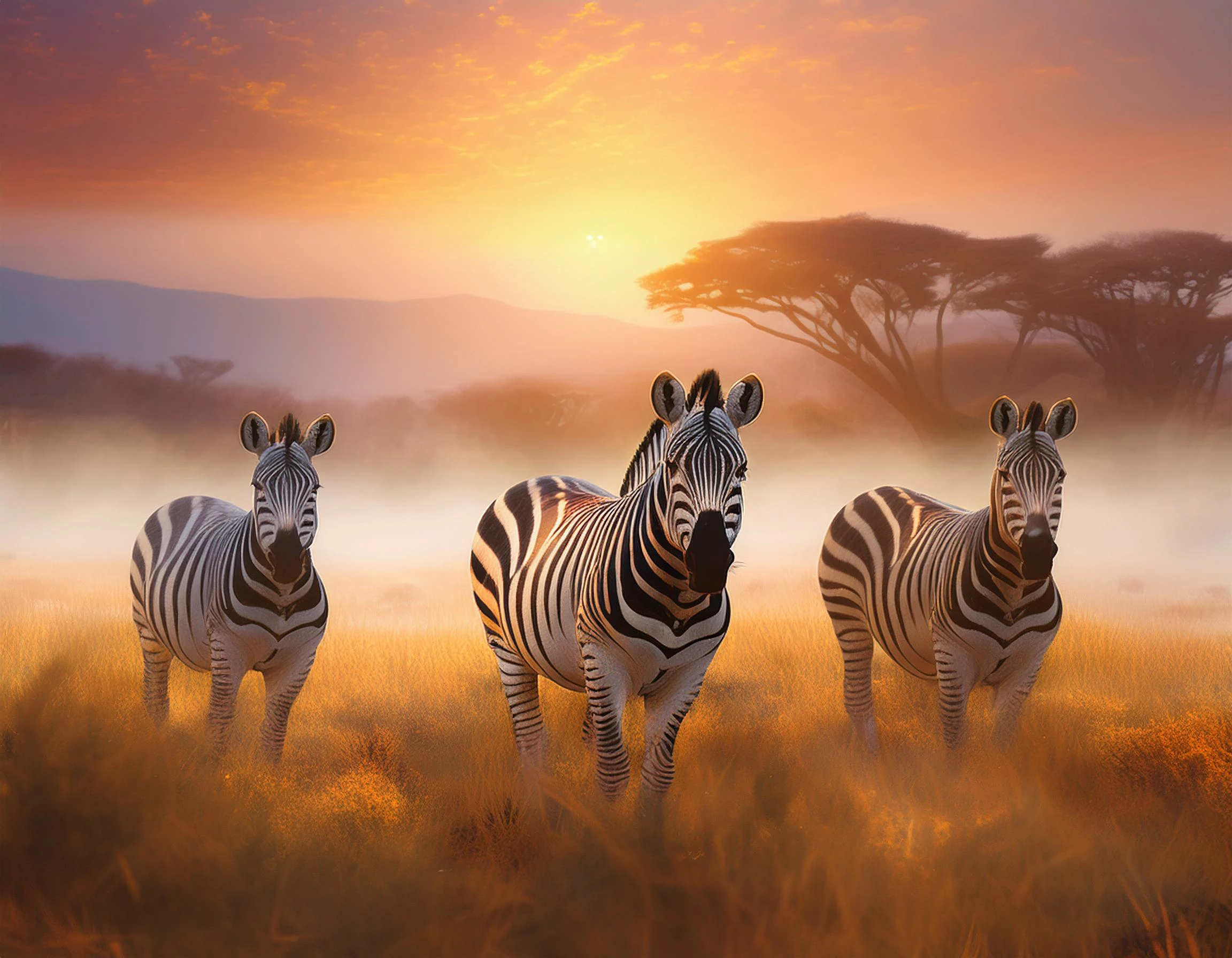 Prompt: realistic herd of zebra close up grazing in a field in Africa at sunrise