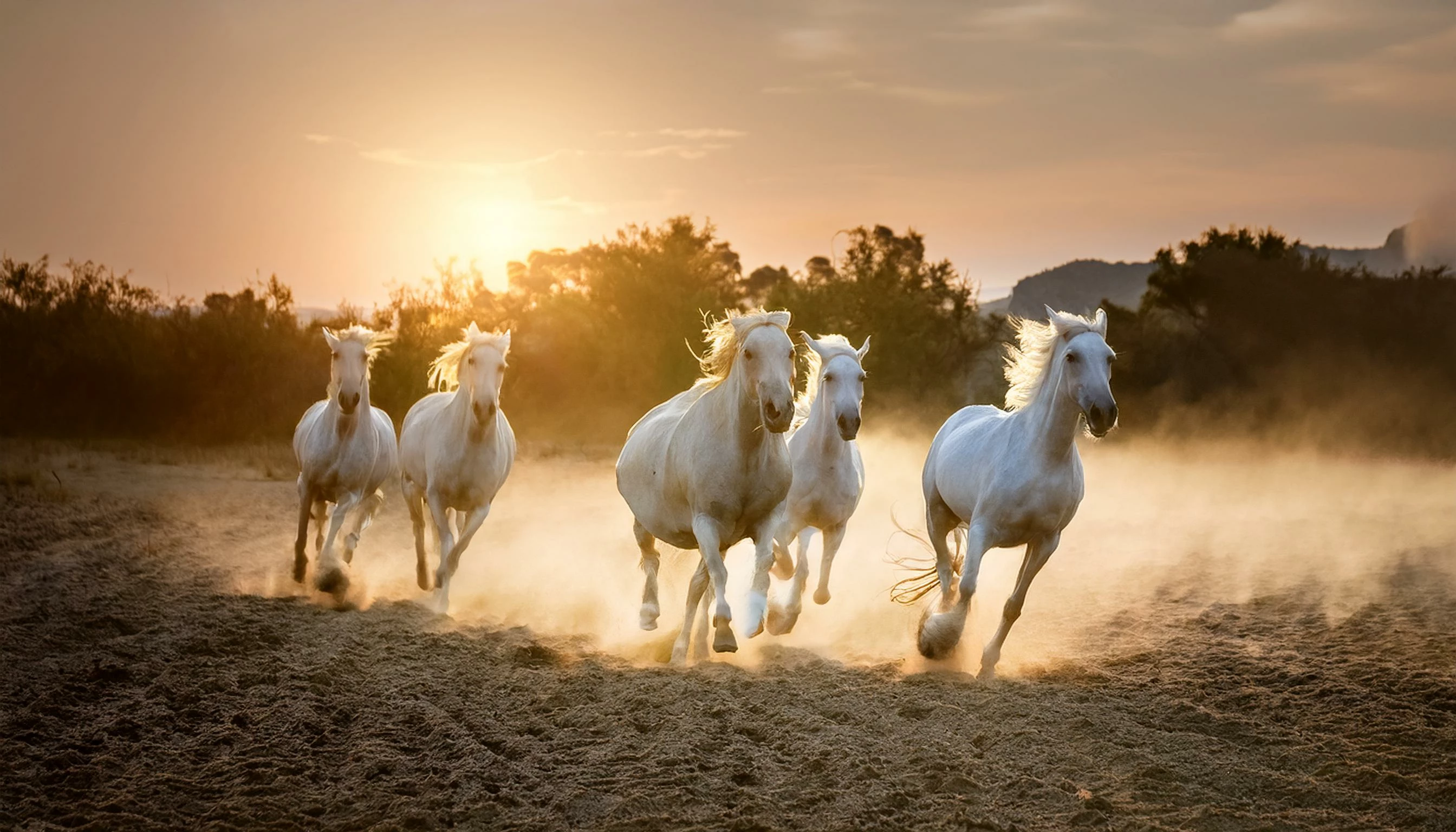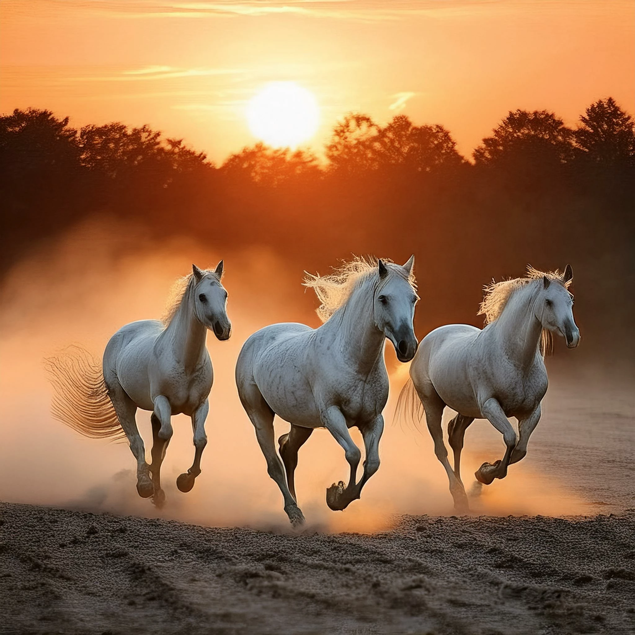 realistic photo of five white regal majestic horses running in empty field. dust getting kicked up behind them. view from behind them. sunset falling in the background. intricate realistic details on horses. photo shoot