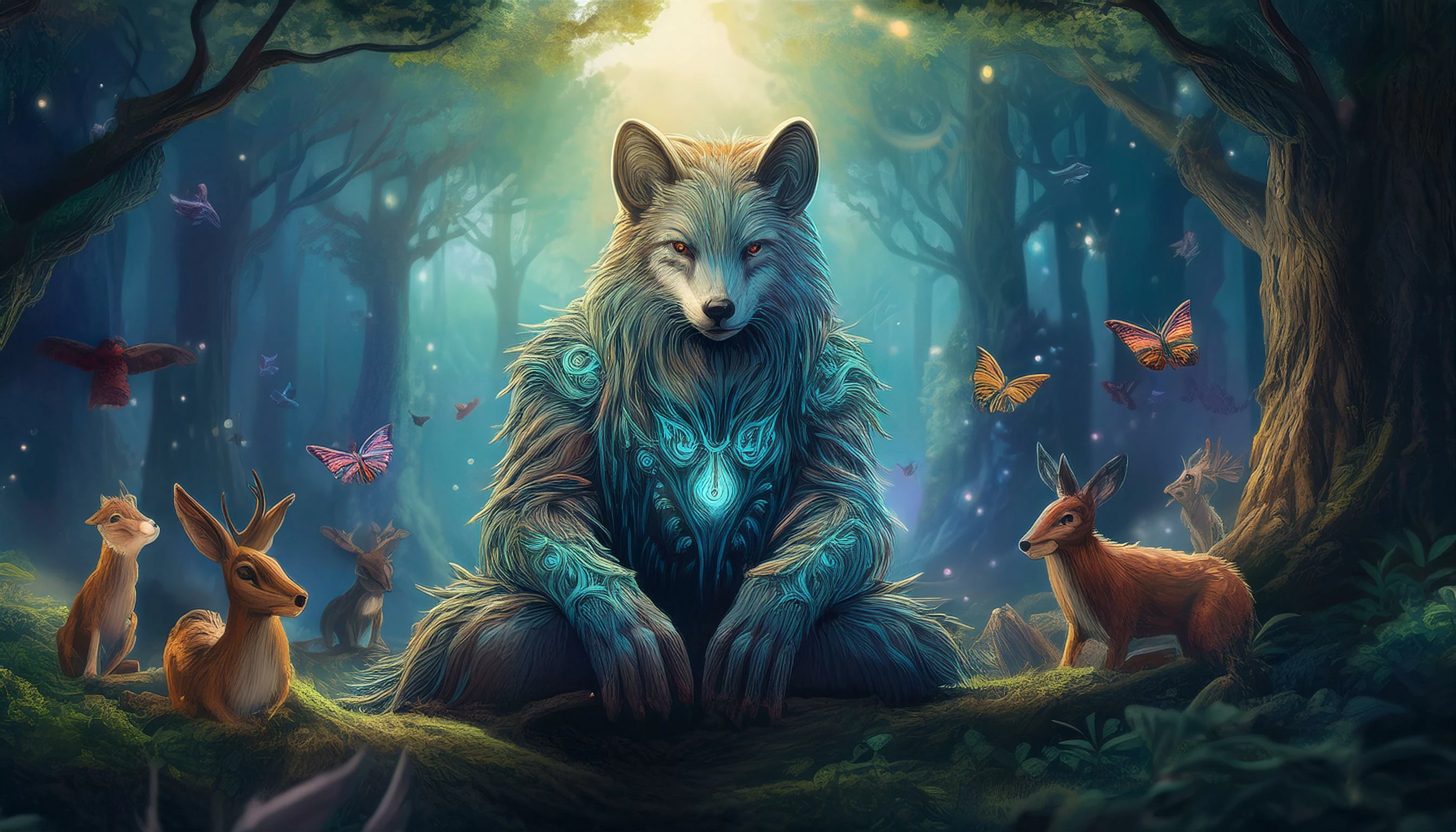 Mystic spirit of the forest sitting among the trees. Forest animals in the background. Magic atmosphere.