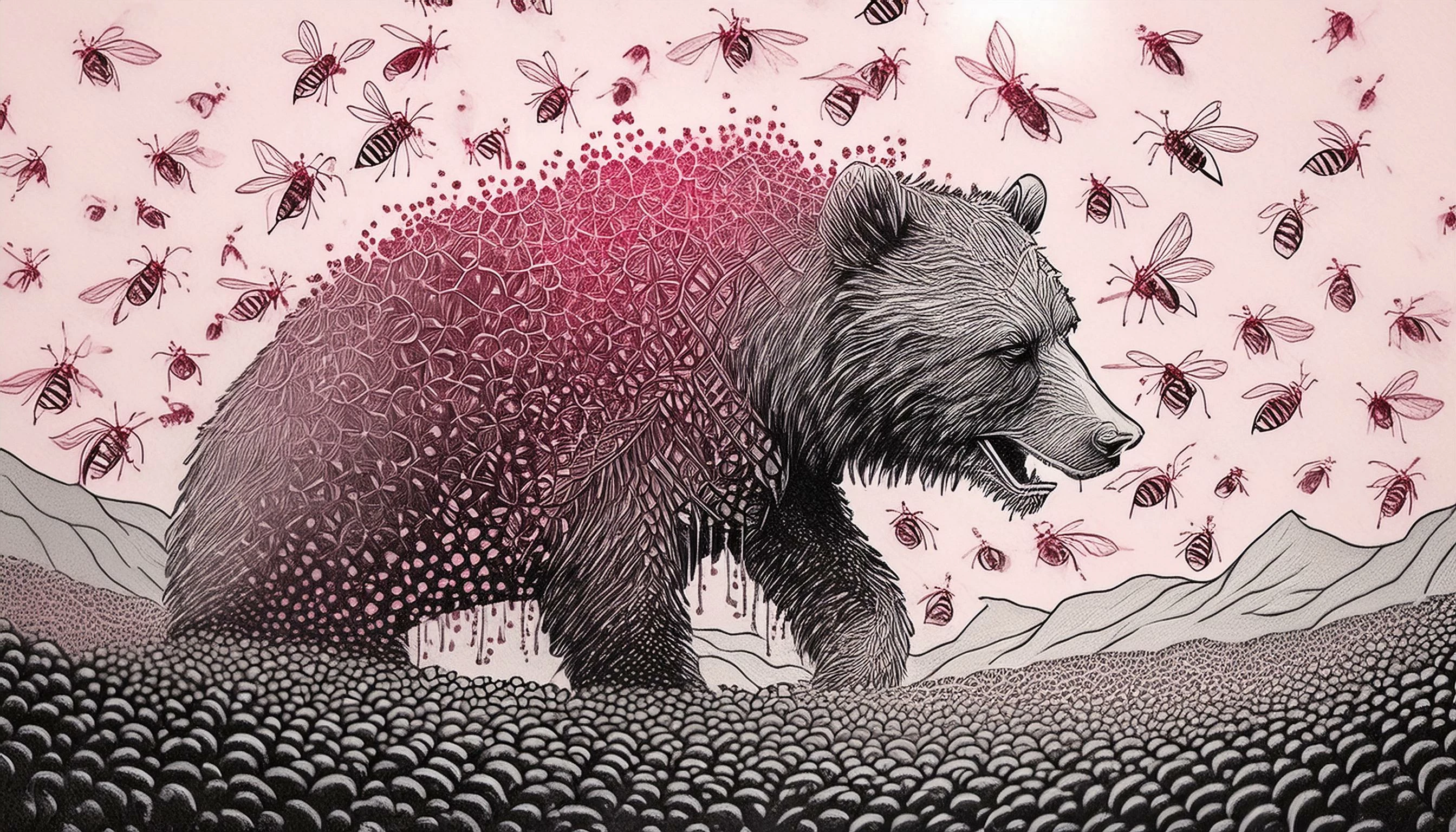 Firefly thousands of bees swarming around a bear +_some filters and style refrences