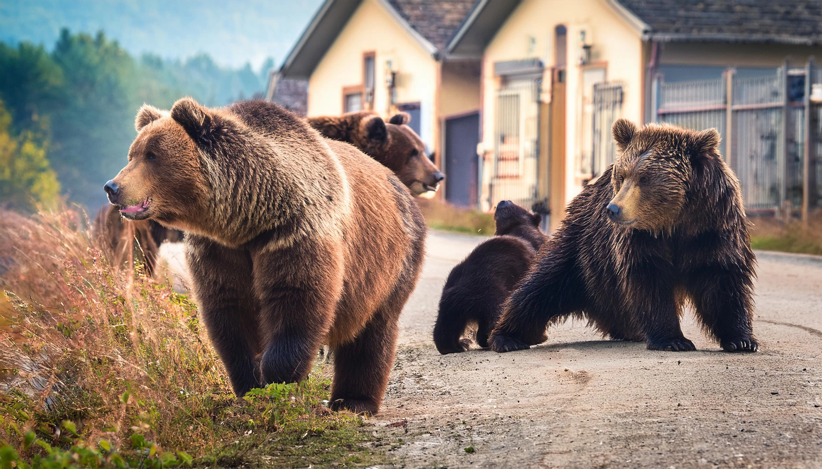 Prompt: grizzly bears in the sub-urban community with humans animal kingdom