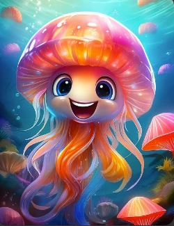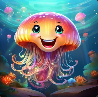 happy playful jelly fish mushroom cartoon character, in bright in Australian coast