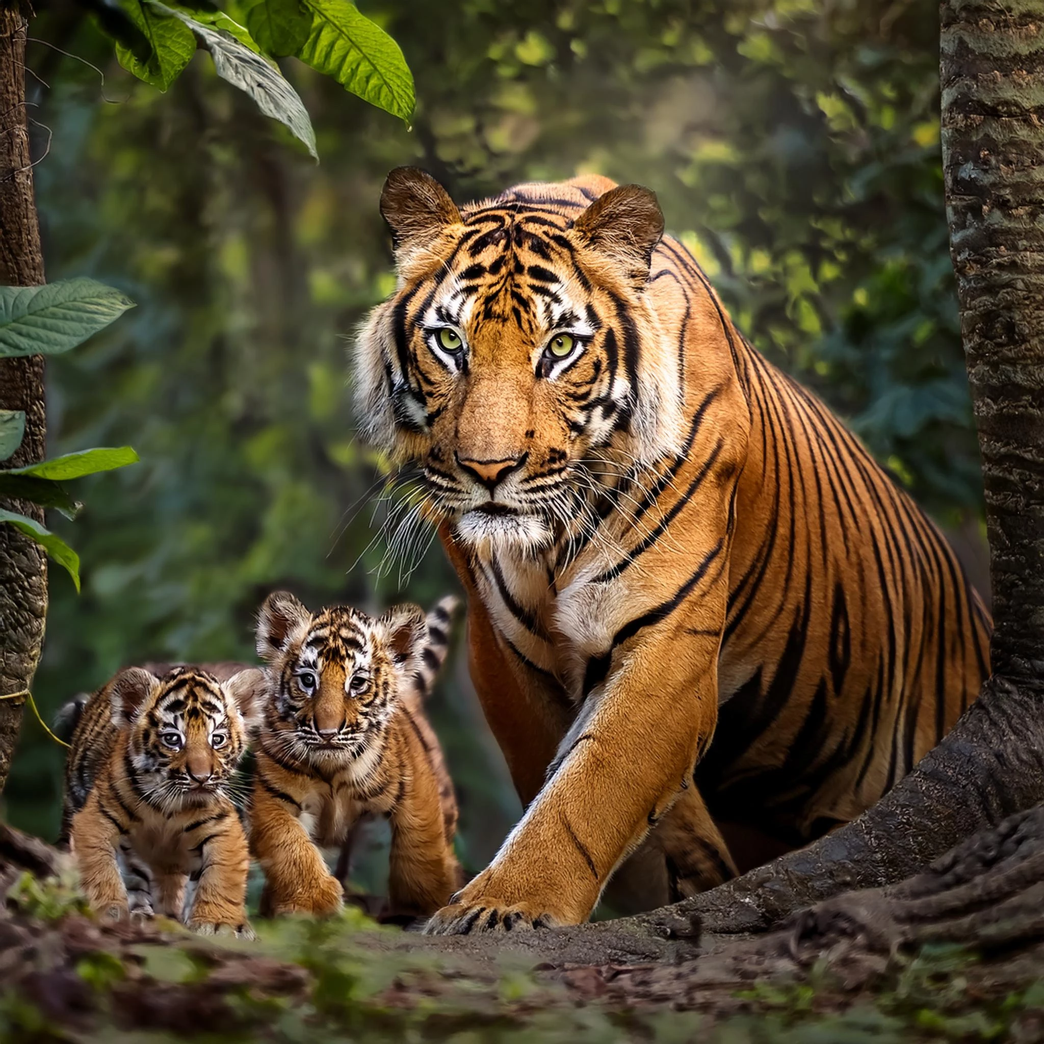 A royal bengal tigress playing with her cubs in the Sundarbans, watching closely surrounding trees
