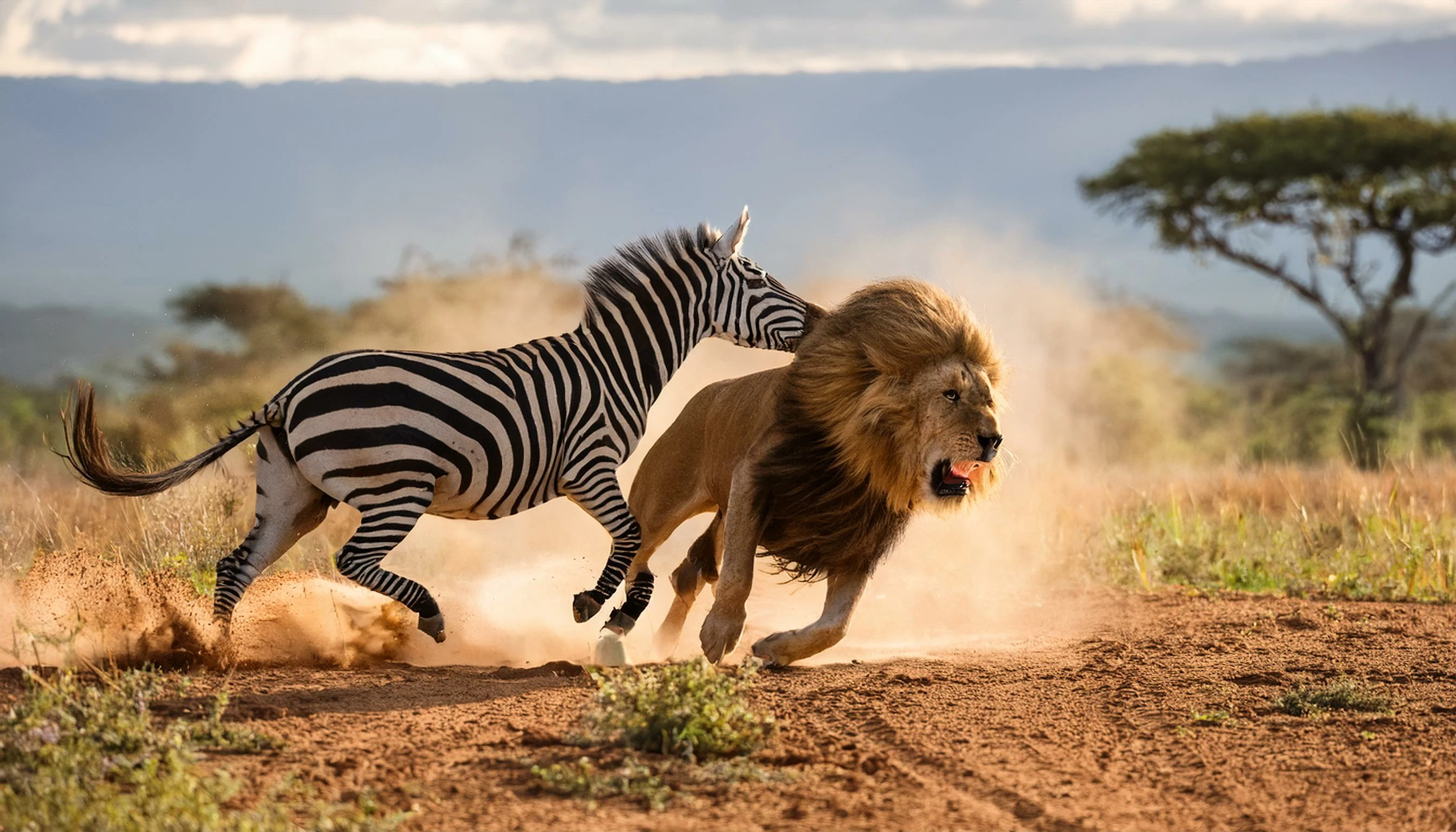 an annoyed zebra in the kenyan savanna, kicking a lion, dust whirling, tense atmosphere