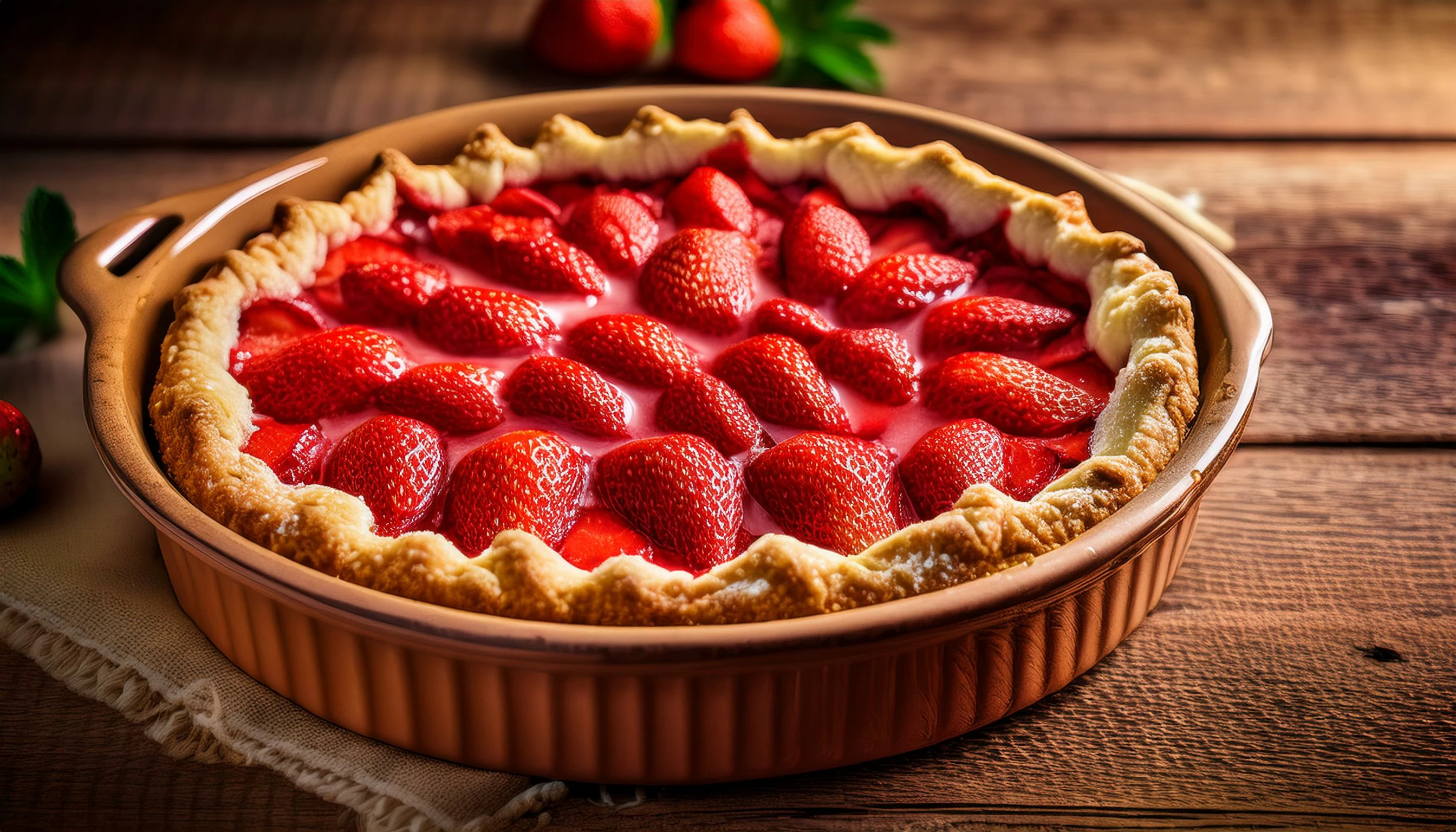 Homemade strawberry pie in terra cotta dish on old farm table