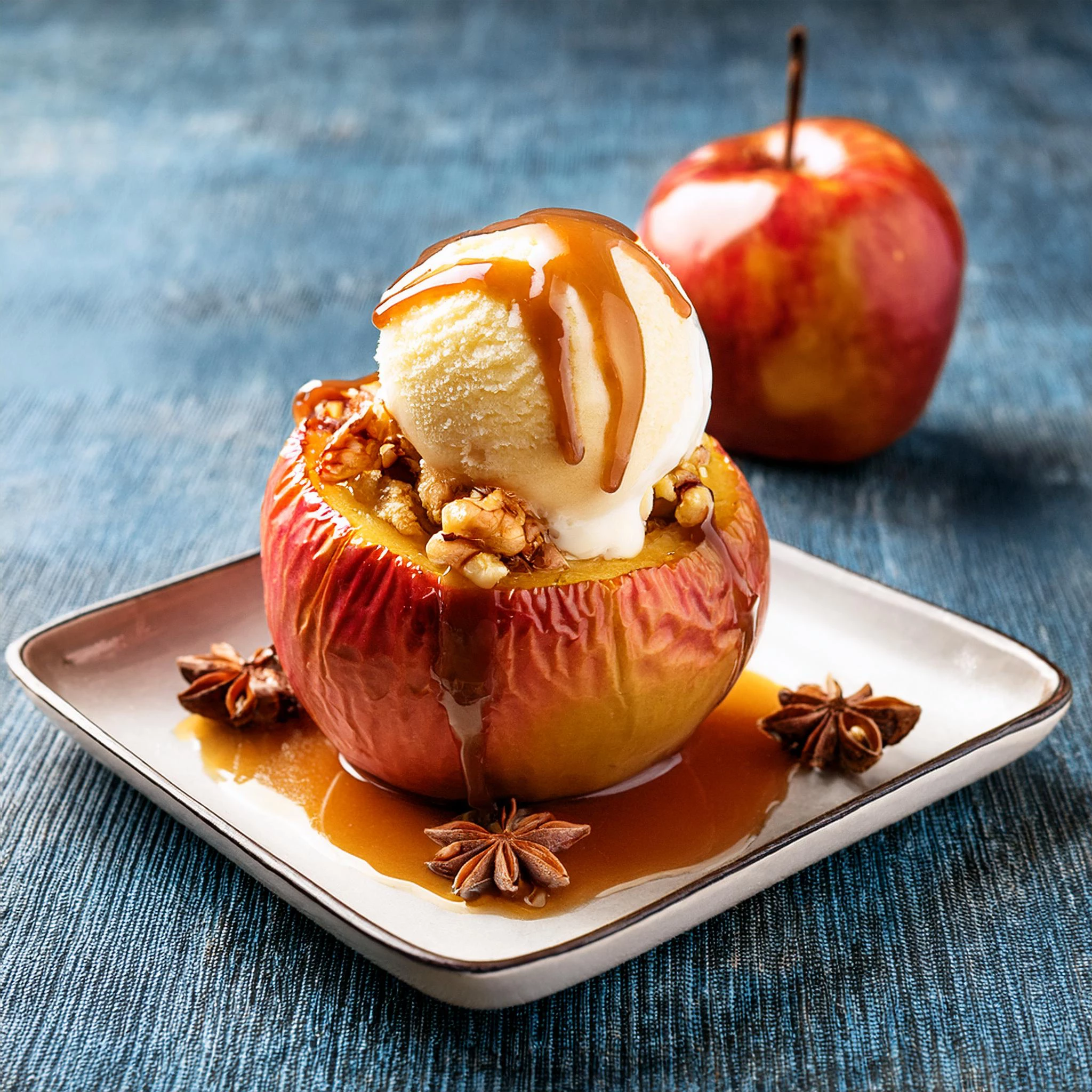 "Baked apple filled with cinnamon apple ice cream and caramel sauce"