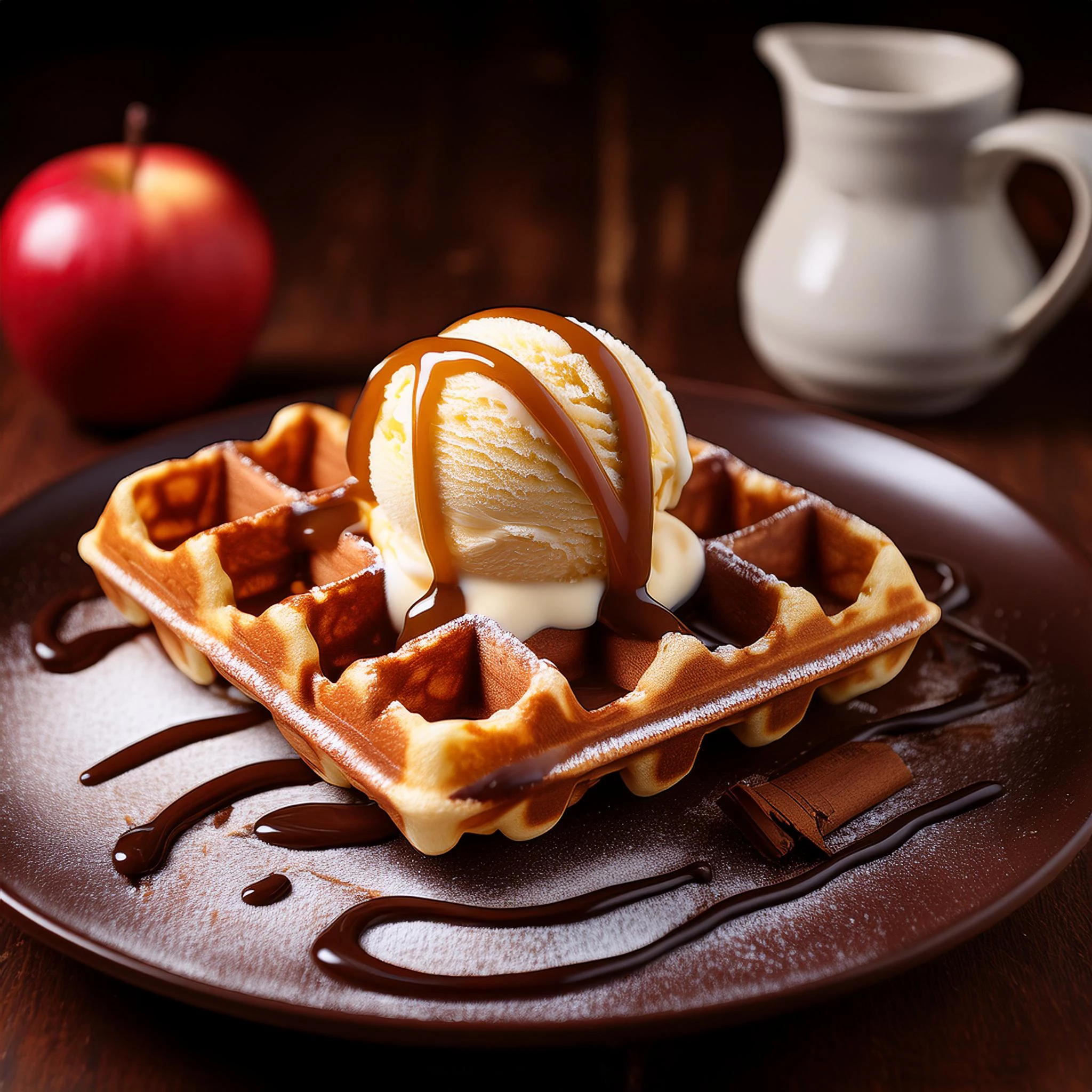 "One Belgian waffle topped with 2 scoops of cinnamon apple ice cream and a lot of hot fudge sauce"