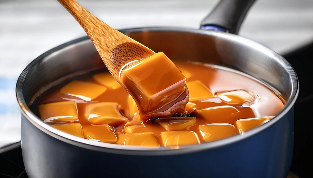 prompt: caramel fudge cooking in pot on stove being stirred with a wooden spoon, with light reflection; selective focus