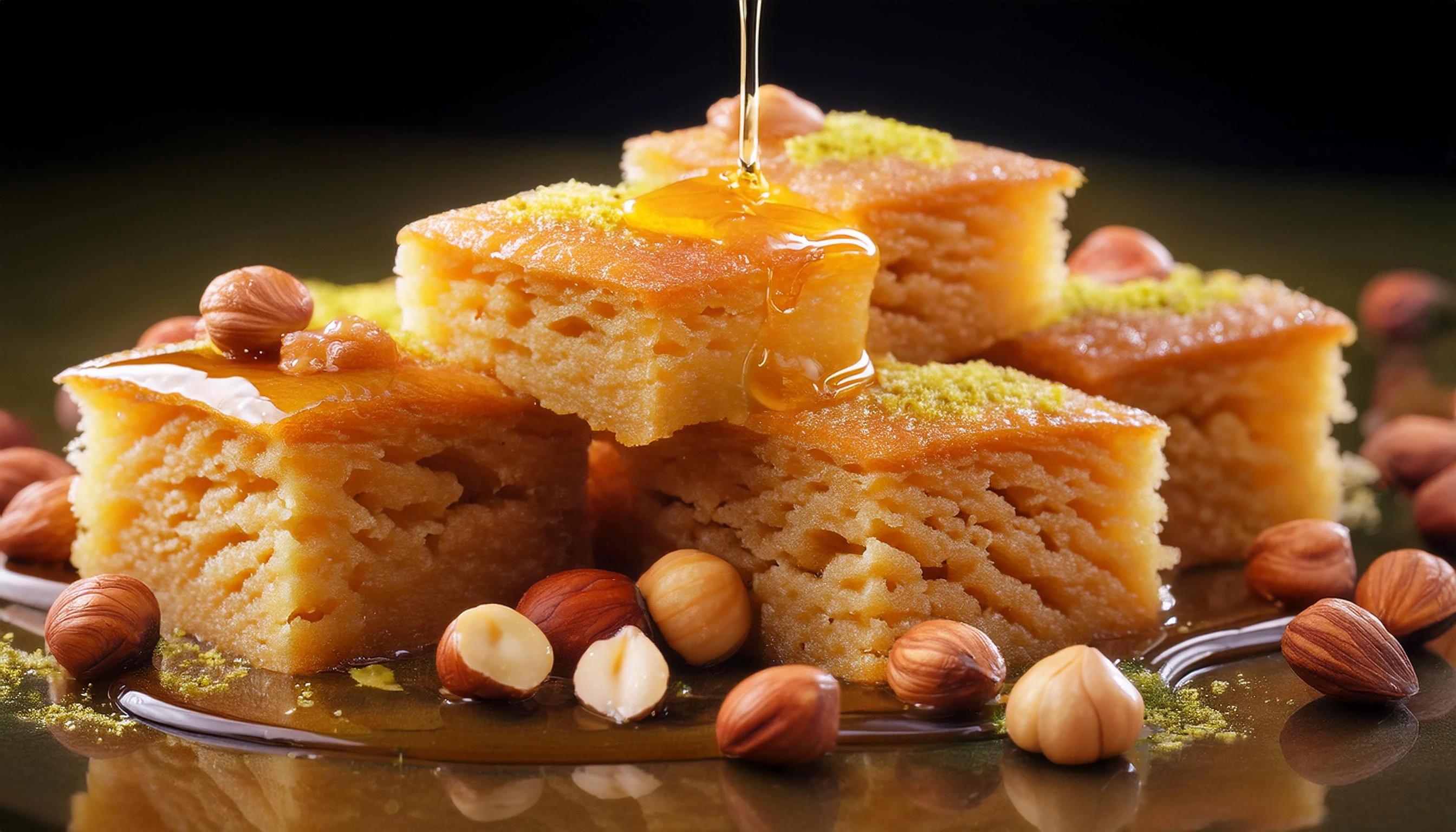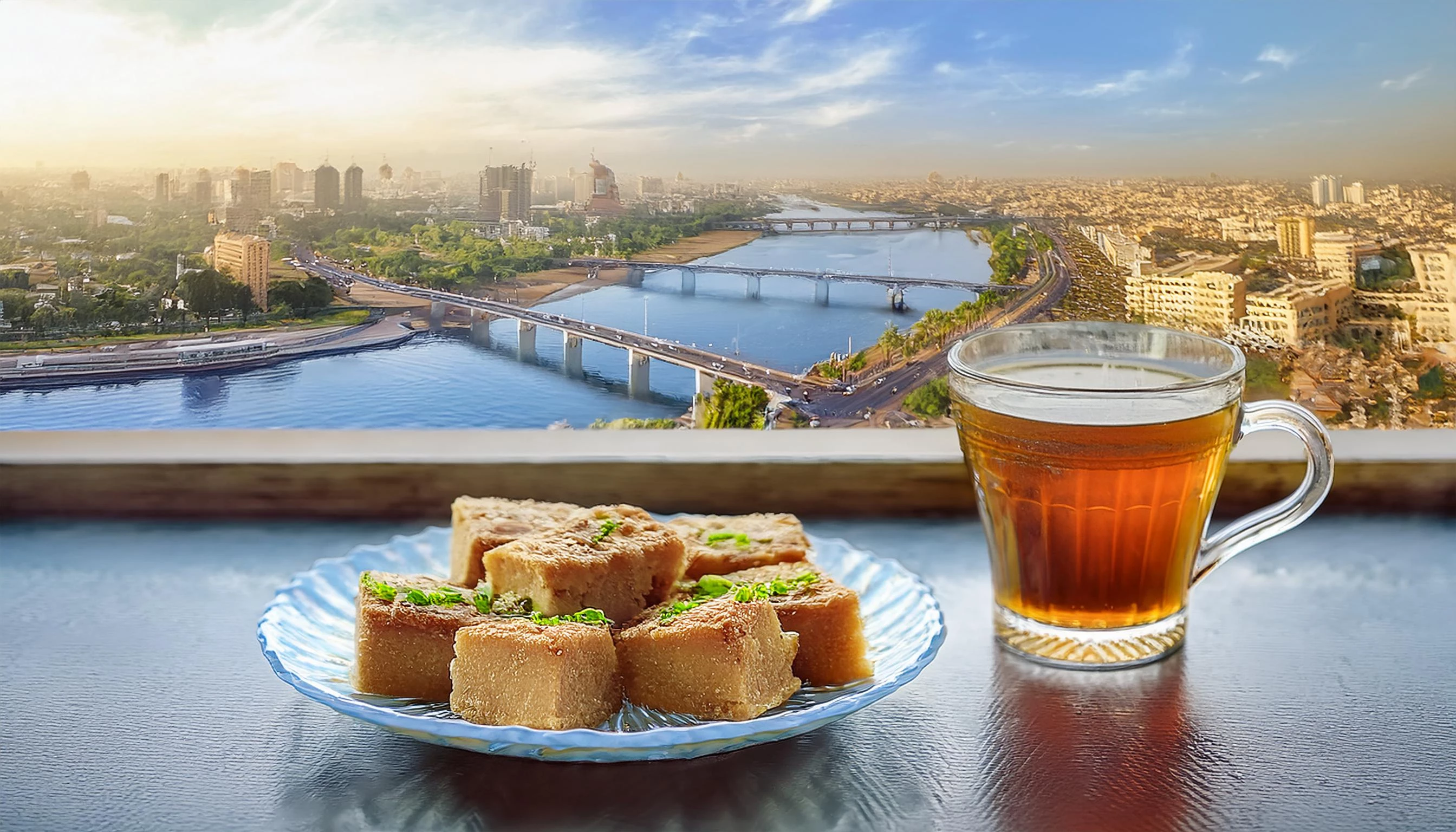 Prompt used: Egyptian juicy pieces of basbousa desert in a plate on a small table. The table contain a modern glass cup of tea. Balcony view on the nile river of Cairo. High resolution details. Cairo buildings and green view.