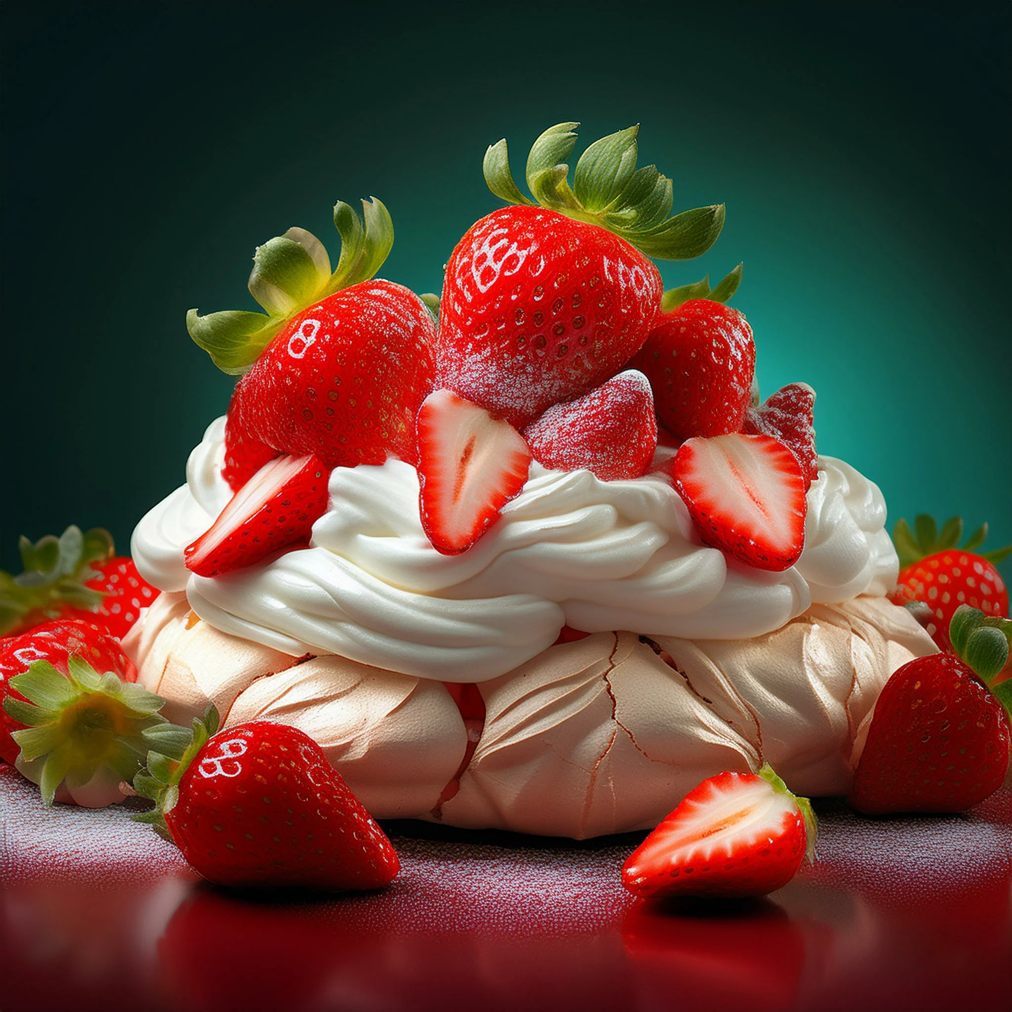 My prompt : Strawberry pavlova in the royal French style, with beautiful strawberries and whipped cream