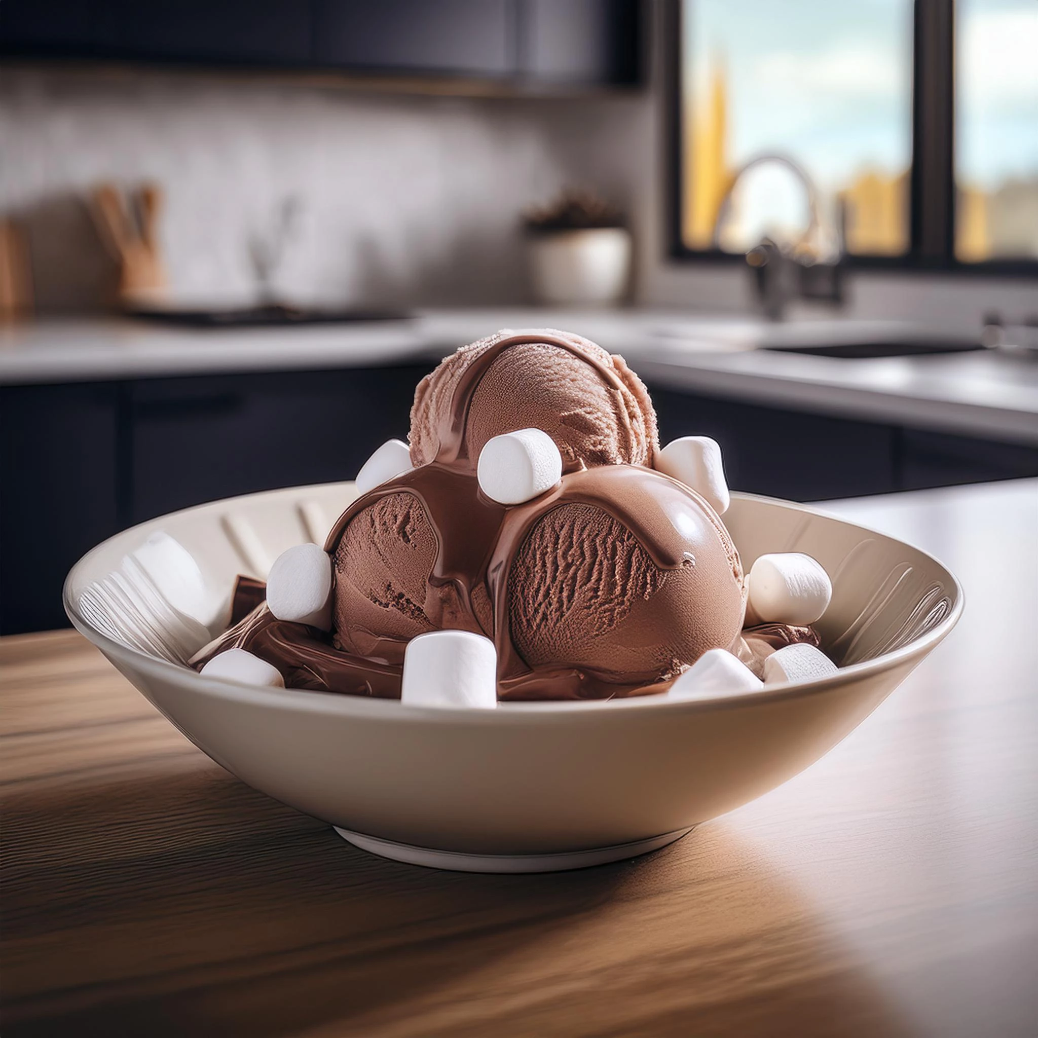 Photo realistic bowl of chocolate ice cream topped with marshmallows, sitting on a countertop in a modern kitchen