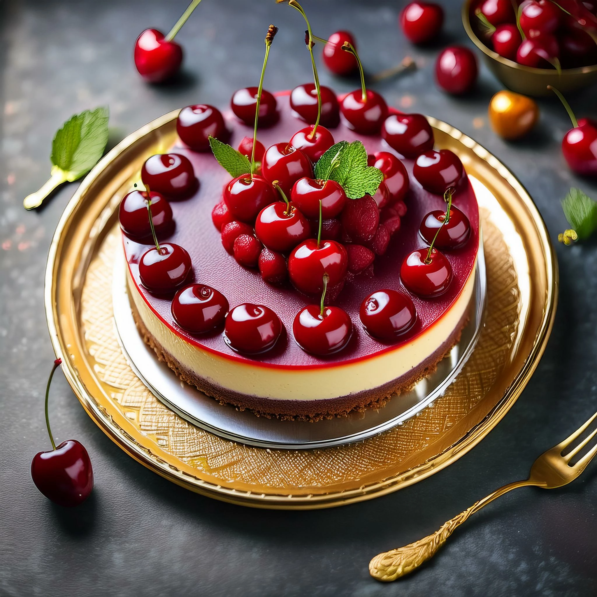 A back to school same treat of organic vegan cherry cheesecake on a gold and silver platter