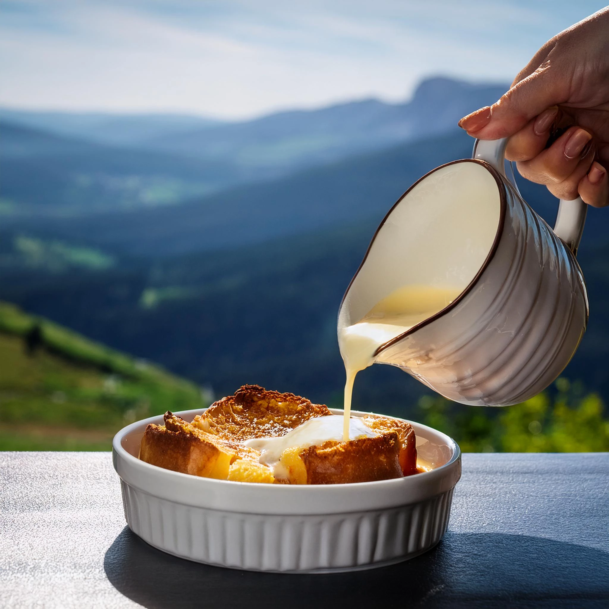 Bread and butter pudding in a bowl with custard being poured from a jug with a view out to the mountains. 😋