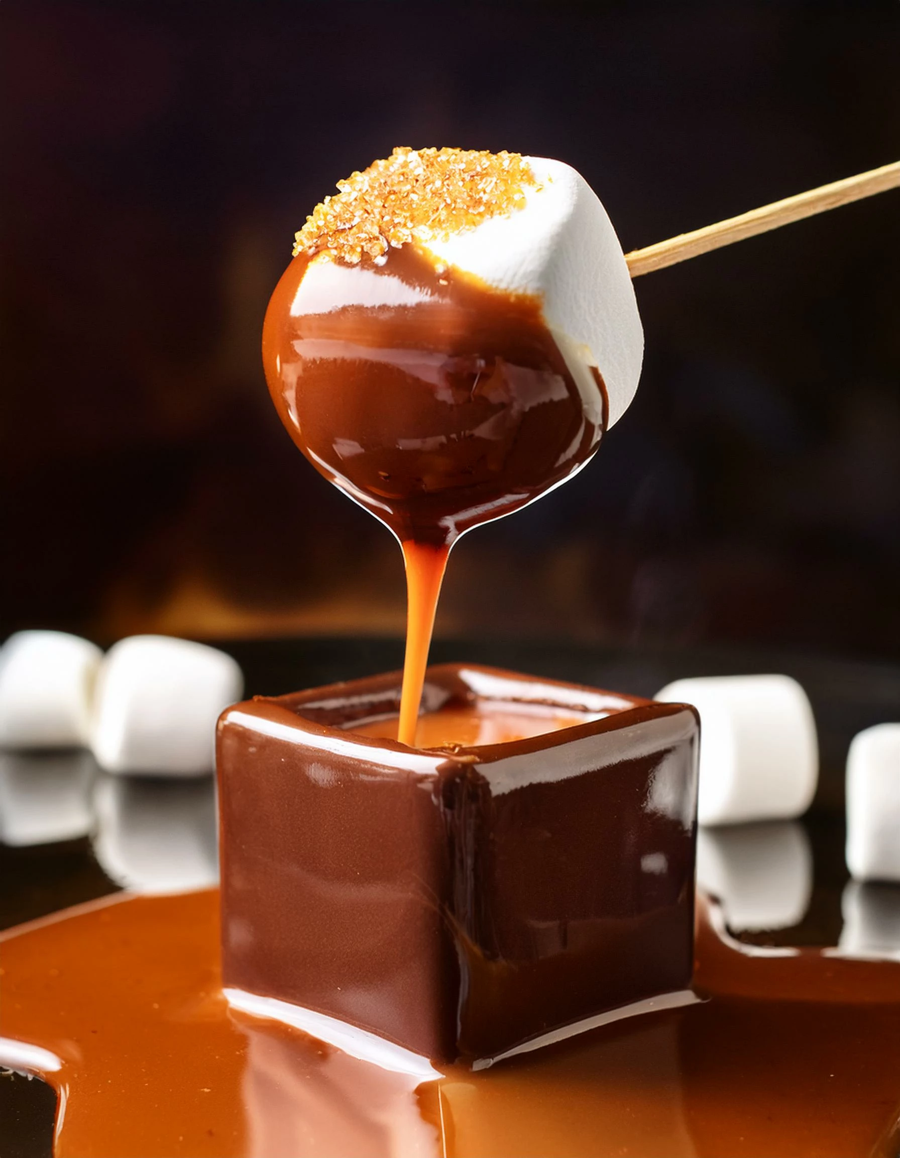 create an image of a rich chocolate dessert fondue surrounded by a moat of glistening melted caramel with marshmallows on a stick for dipping, sprinkle some salt flake on top [Photo] [Composition Reference]